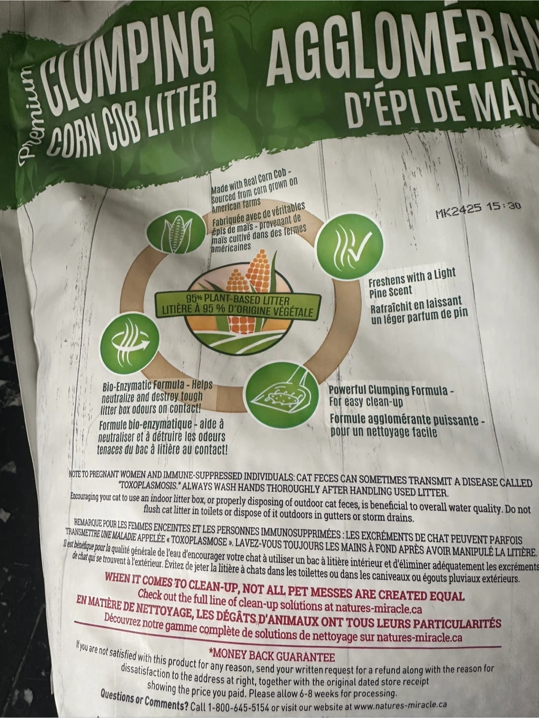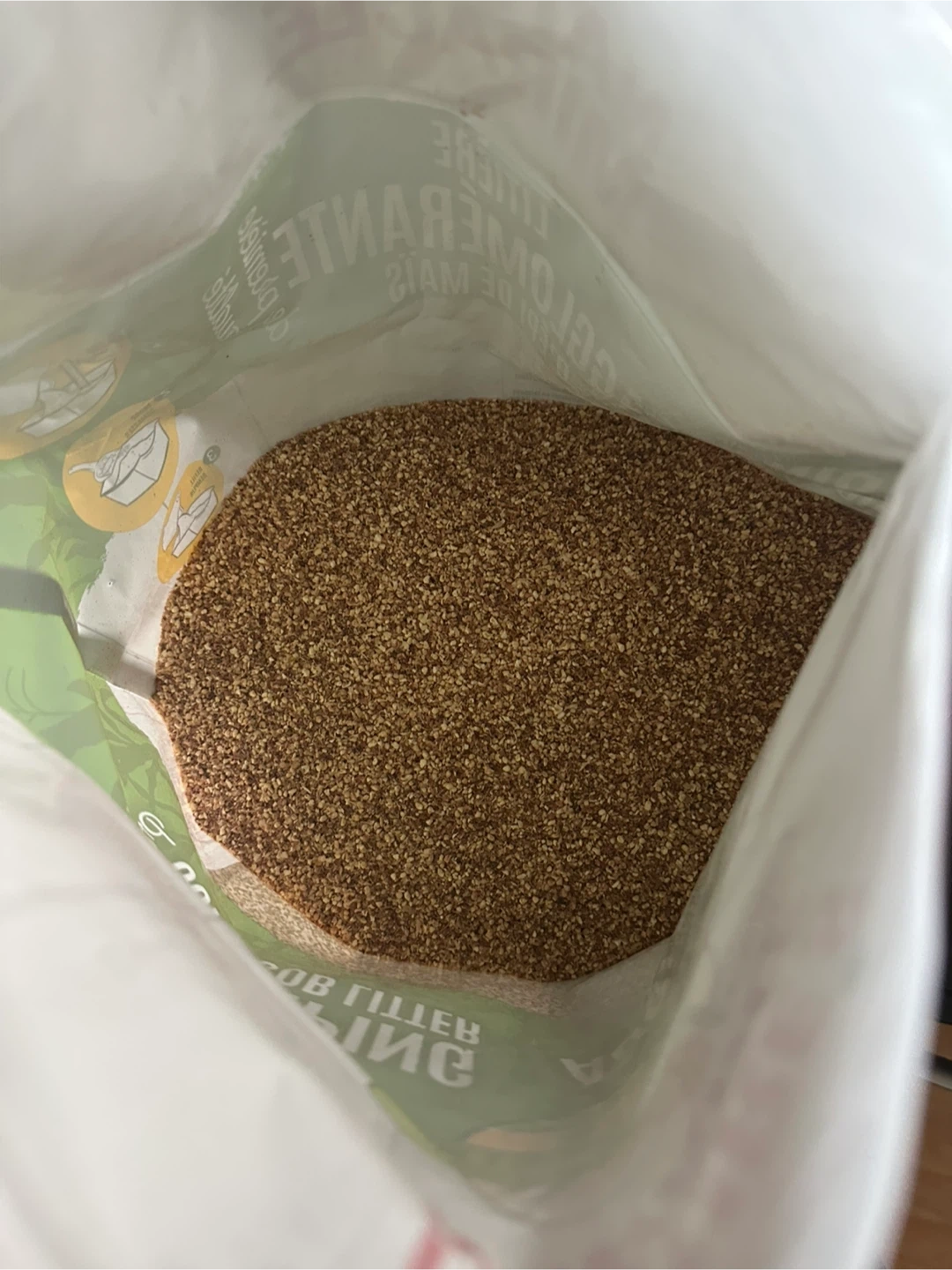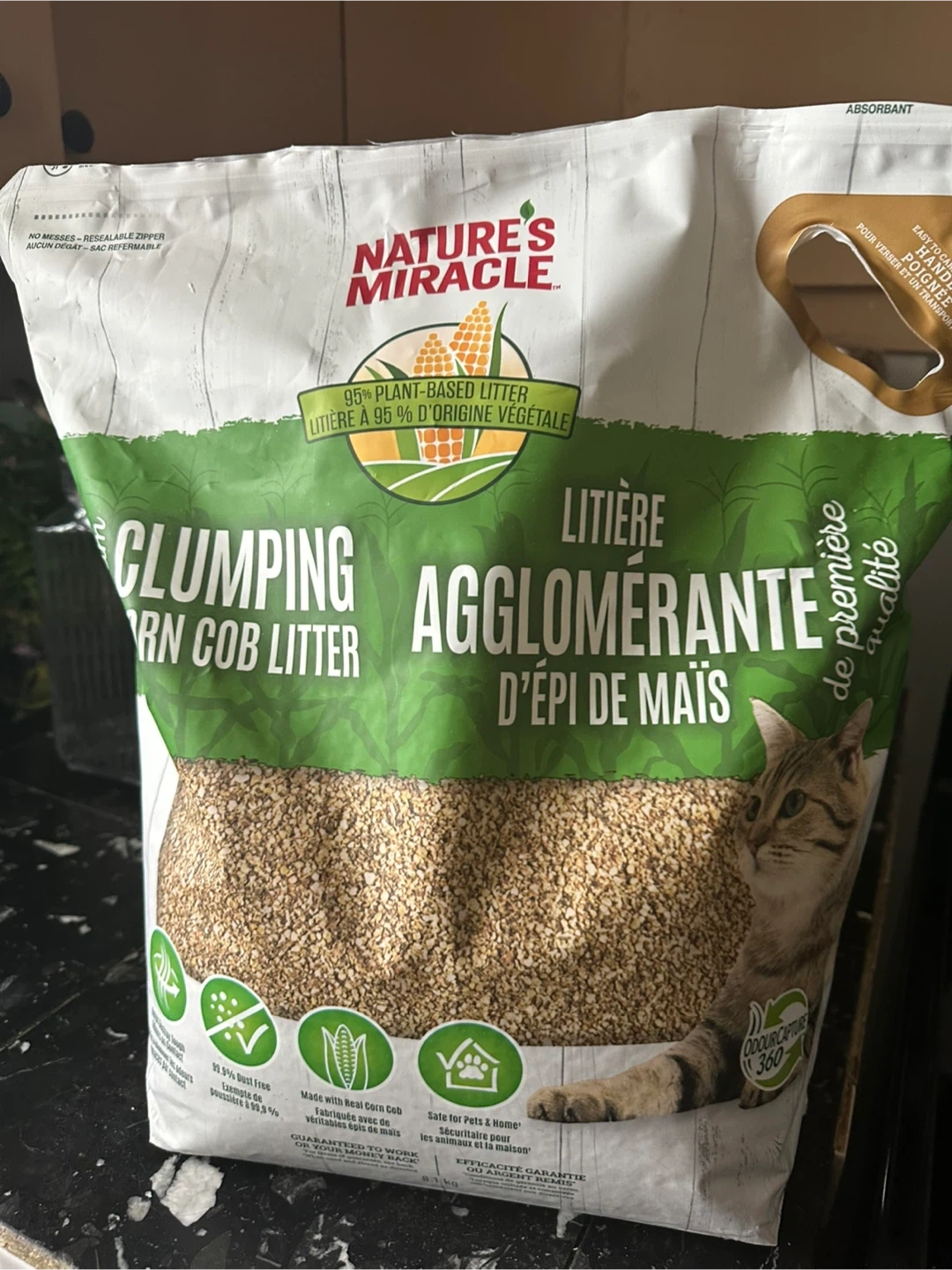 This is Nature's Miracle clumping corn cob litter. It's 99.9% dust-free and made with real corn cob. The bag is resealable for no messes! It's safe for pets and home. Some has been used to fill a litter box once, selling as I no longer need. Smoke free home.