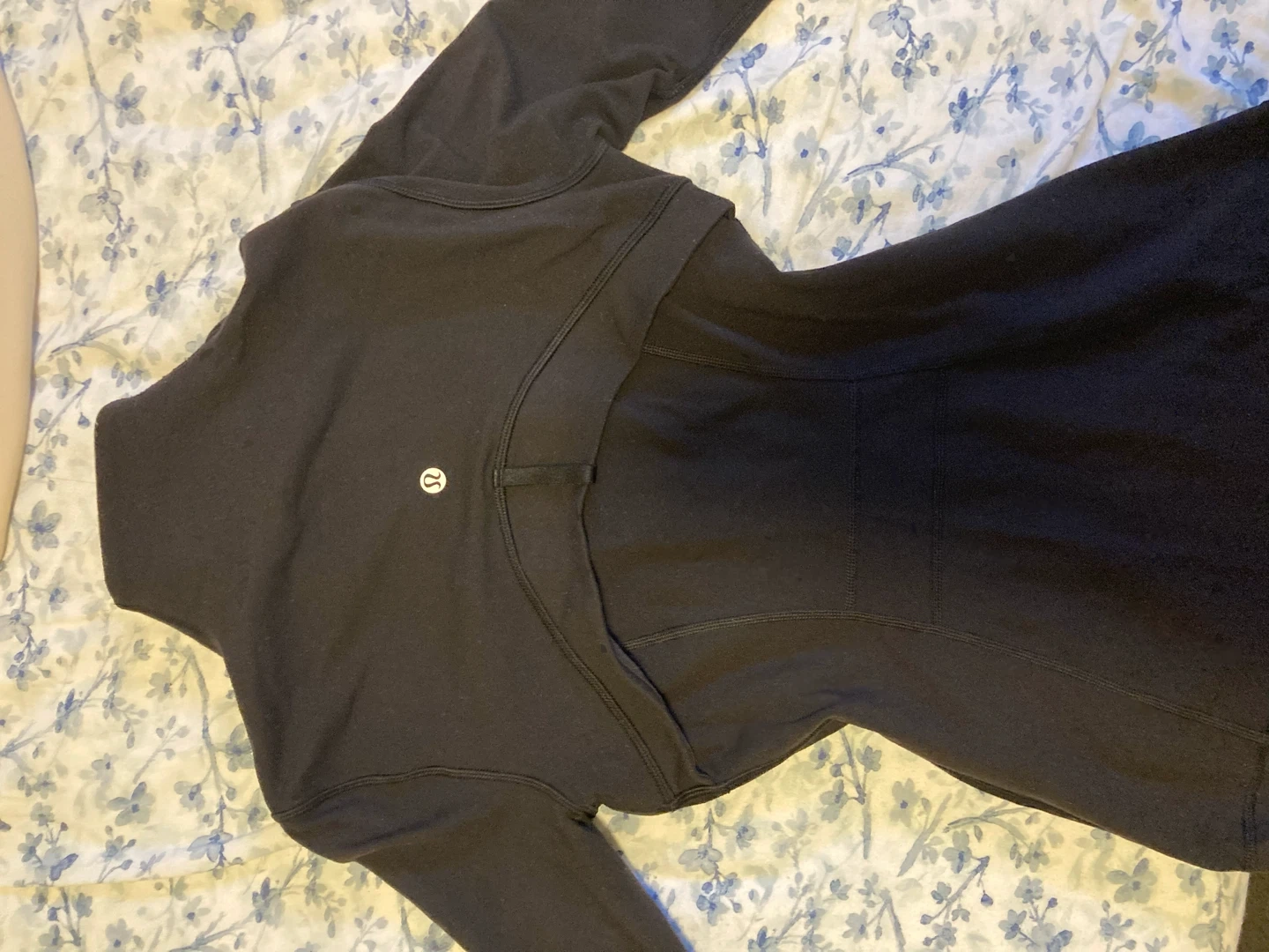 lululemon athletic zip up jacket in black. full zip closure with zippered pockets. It's made of a comfortable, stretchy fabric. works for workouts or casual wear. Zipper still on