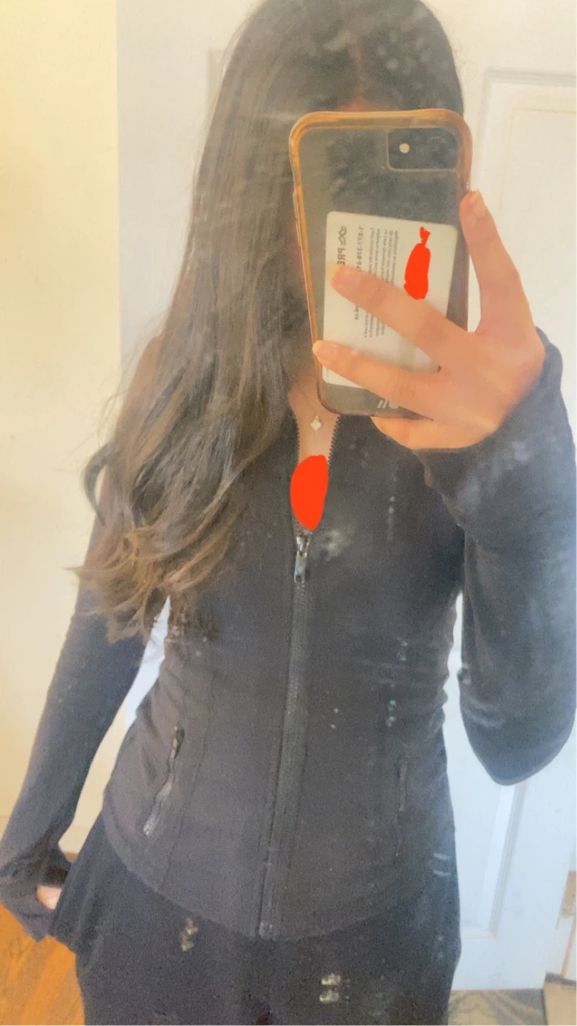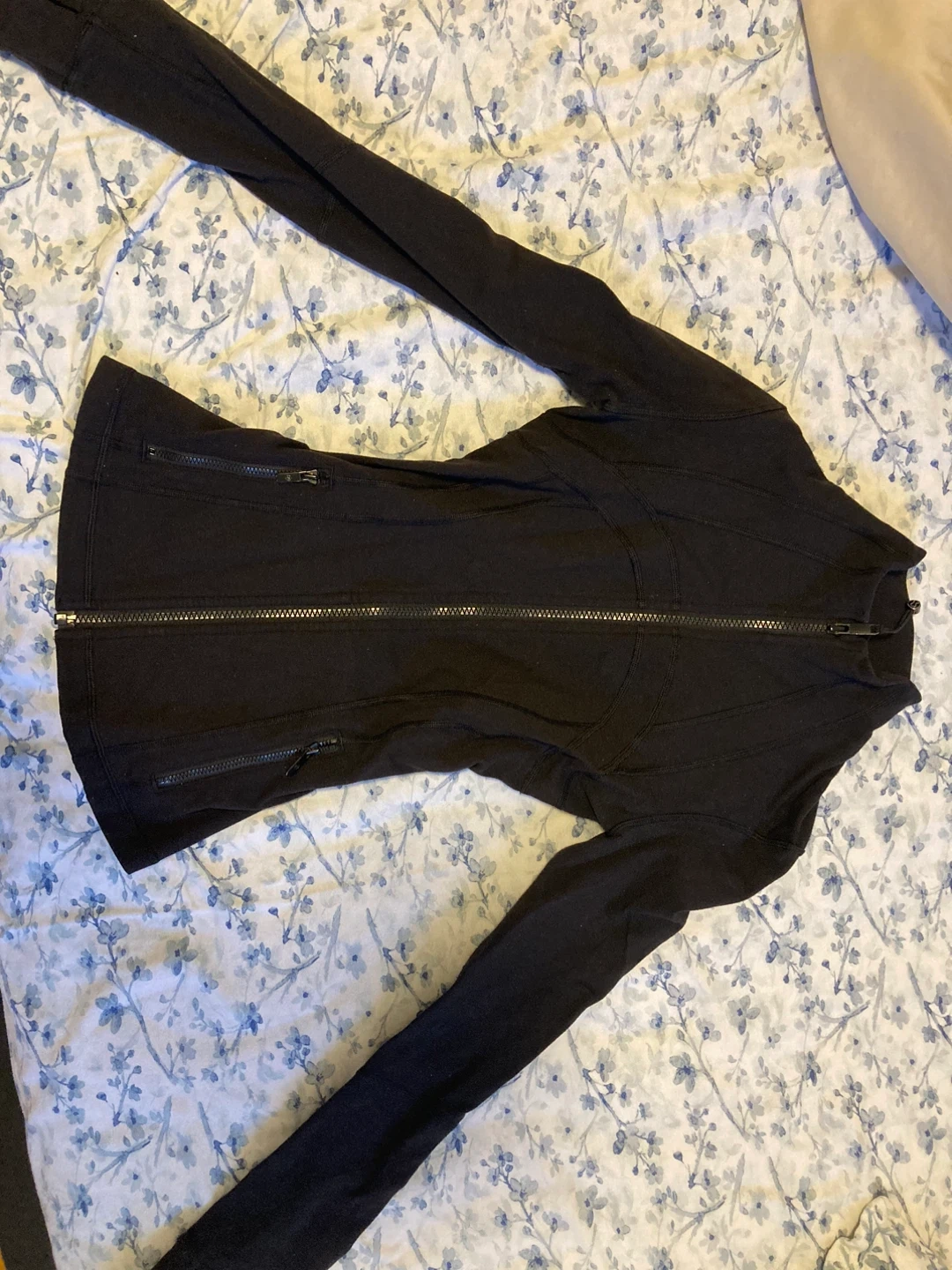 lululemon athletic zip up jacket in black. full zip closure with zippered pockets. It's made of a comfortable, stretchy fabric. works for workouts or casual wear. Zipper still on