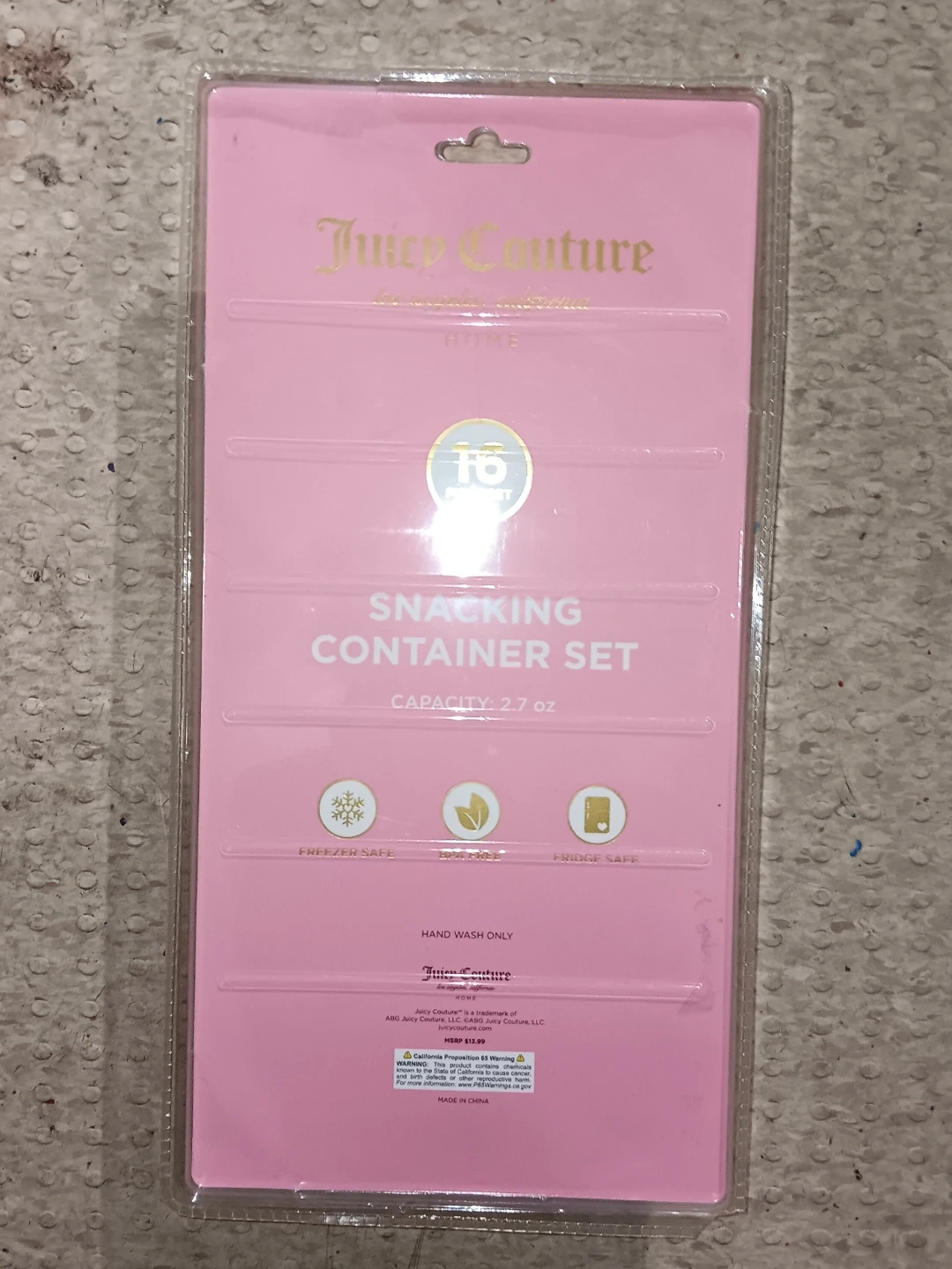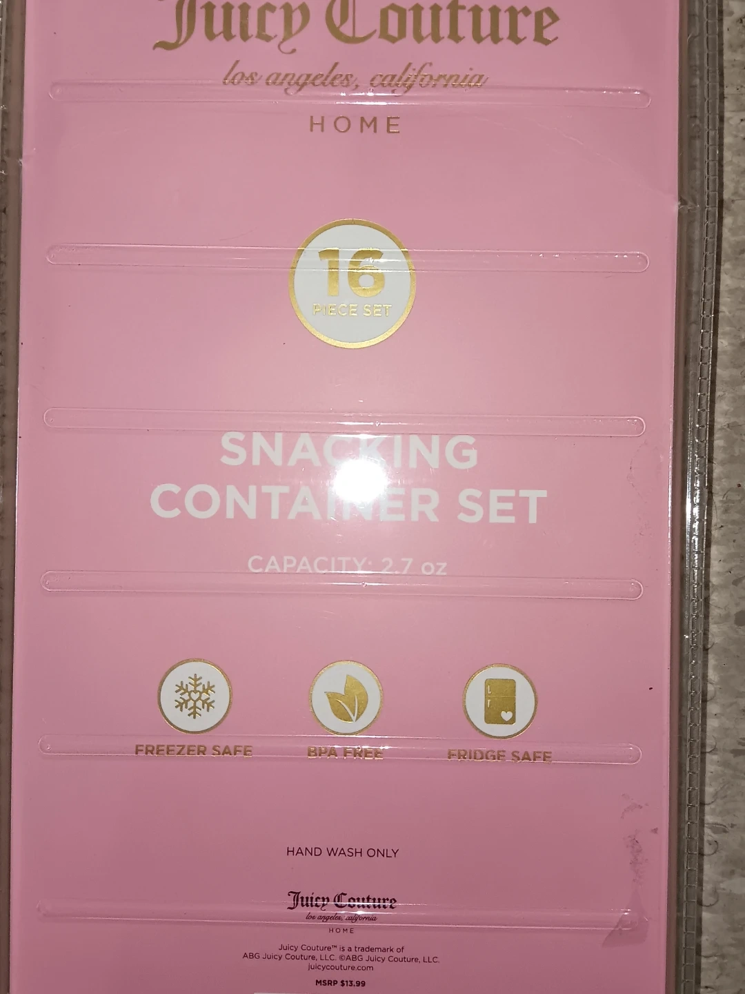 This is a 16 piece snacking container set from Juicy Couture Home. The containers are heart-shaped and pink with the JC logo. Each container has a capacity of 2.7 oz. They are freezer safe and fridge safe. Hand wash only.