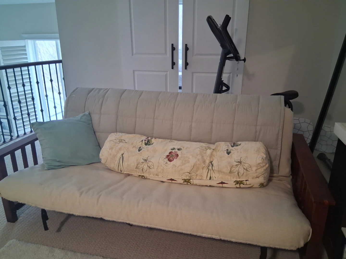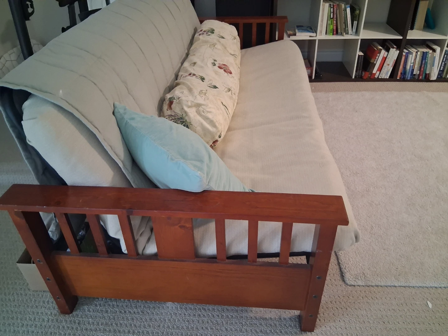 Comfortable futon sofa bed with a wooden frame. It comes with a decorative cushion. This piece provides versatile seating and sleeping options.