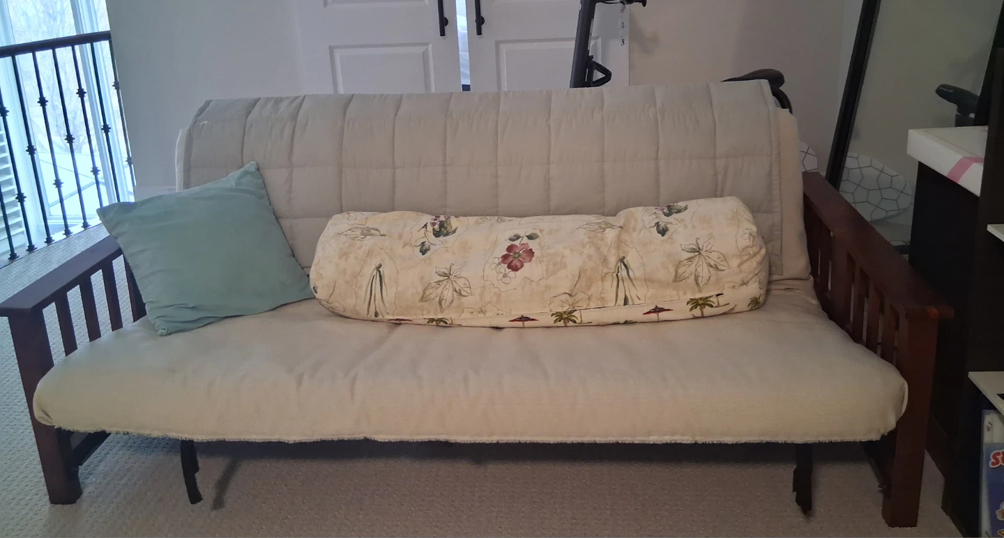 Comfortable futon sofa bed with a wooden frame. It comes with a decorative cushion. This piece provides versatile seating and sleeping options.