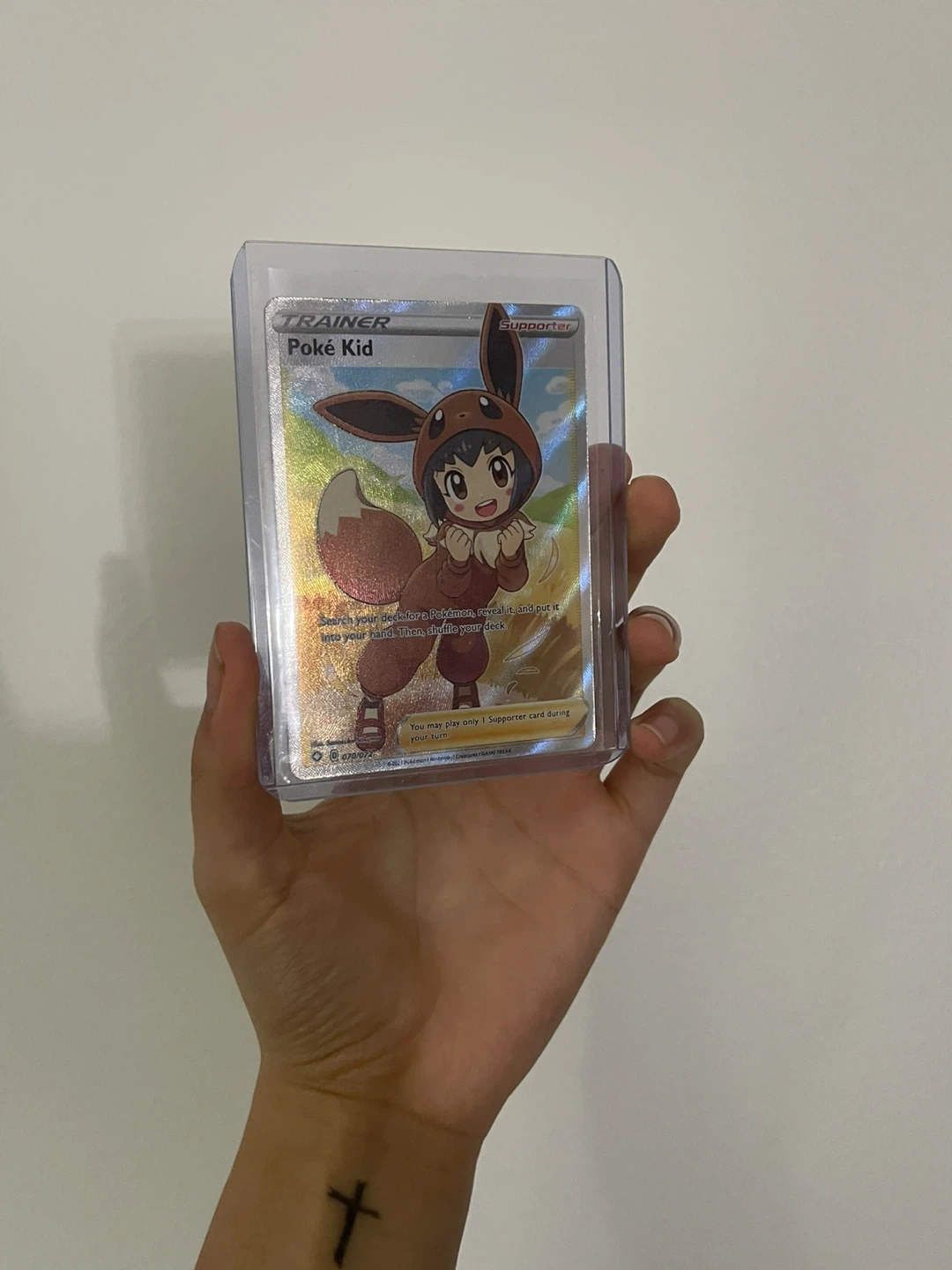 This ungraded Poké Kid Full Art Trainer card is in excellent condition, kept securely in a protective sleeve and handled with care. The surface has strong shine with no visible scratches, dents, or whitening. Edges and corners appear sharp, and the artwork is vibrant and clean.