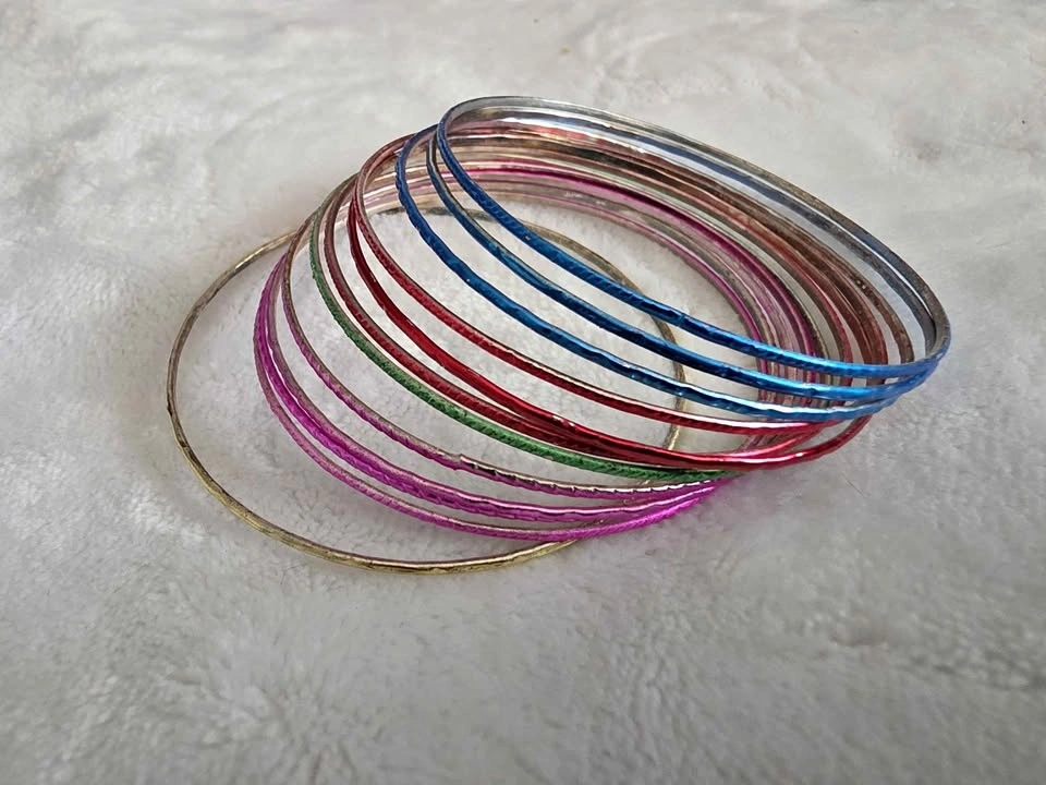 Includes 1 gold, 4 pink, 1 green, 3 red, and 3 blue bangle bracelets. These are kid-sized and would make a great gift for parties or as party favors. Total of 12 bracelets.