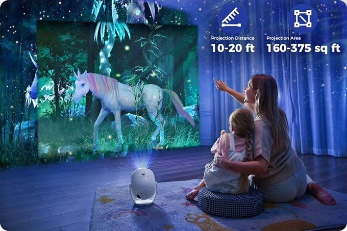 LIKE NEW. It offers over 50 3D animation themes, from forests and oceans to space and festivals, making it ideal for home gatherings, meditation, and sleep aids. With 4K resolution and high-saturation projection, it delivers vivid, lifelike visuals enhanced by synchronized audio-visual effects. The projector has a wide projection area and 180° rotation for immersive experiences. It synchronizes light and music precisely, creating atmosphere with lighting that matches the rhythm for an immersive, live-like experience. Original price was $169+ Shipping and Taxes. Product page: https://tinyurl.com/twelvetoo