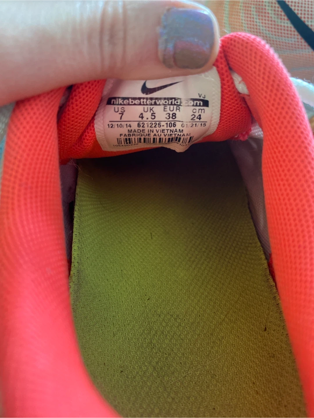 Size 7, EU 38 These Nike Tailwind 7 running shoes are designed for comfort and performance. They feature a breathable mesh upper and a cushioned sole for excellent shock absorption. The vibrant pink and orange colourway makes them stylish for both workouts and casual wear. Made in Vietnam.