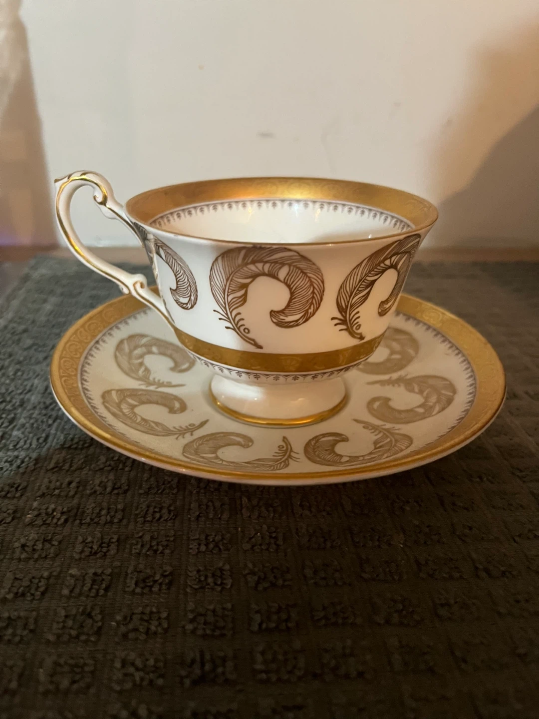 Elegant white teacup and saucer with a gold trim. Features a delicate brown feather design. Porcelain material. Bone China
