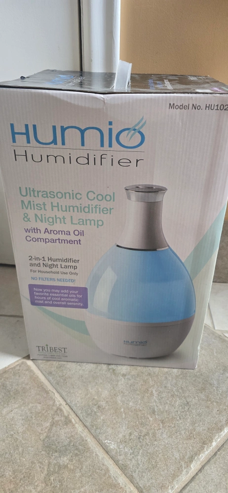 BRAND NEW .Selling a brand new Humio Ultrasonic Cool Mist Humidifier and Night Lamp. It's still in its original box! This 2-in-1 humidifier with aroma oil compartment is perfect for household use and requires no filters. It features a 360° rotating mist outlet, a removable neck for easy cleaning, and a half-gallon water tank. It also has LED lighting technology and easy push buttons.