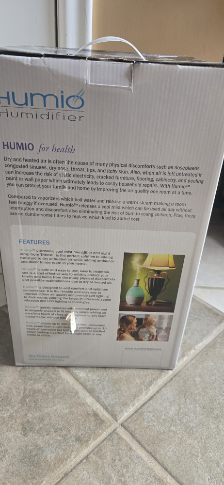 BRAND NEW .Selling a brand new Humio Ultrasonic Cool Mist Humidifier and Night Lamp. It's still in its original box! This 2-in-1 humidifier with aroma oil compartment is perfect for household use and requires no filters. It features a 360° rotating mist outlet, a removable neck for easy cleaning, and a half-gallon water tank. It also has LED lighting technology and easy push buttons.