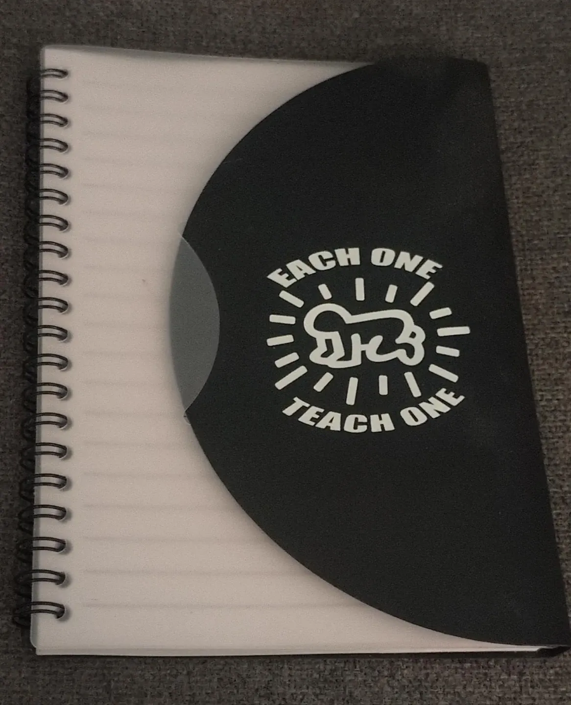 Spiral-bound notebook featuring the iconic Keith Haring "Each One Teach One" artwork. It has a clear plastic cover over lined paper. This notebook's design is great for artists or students.
