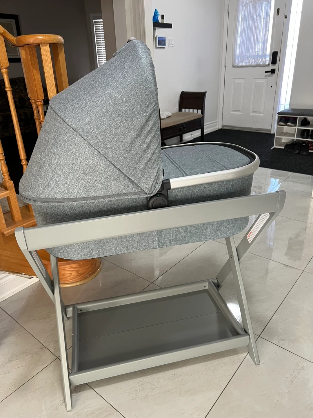 This UPPAbaby bassinet comes with its own stand, making it super handy for your little one. It's a comfy spot for naps and has a grey fabric finish. Great for newborns!