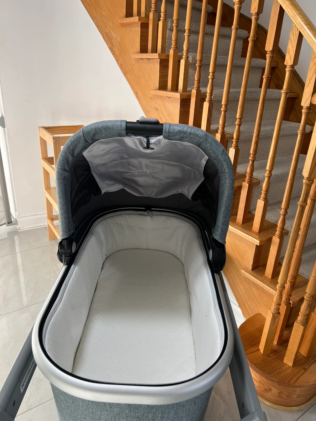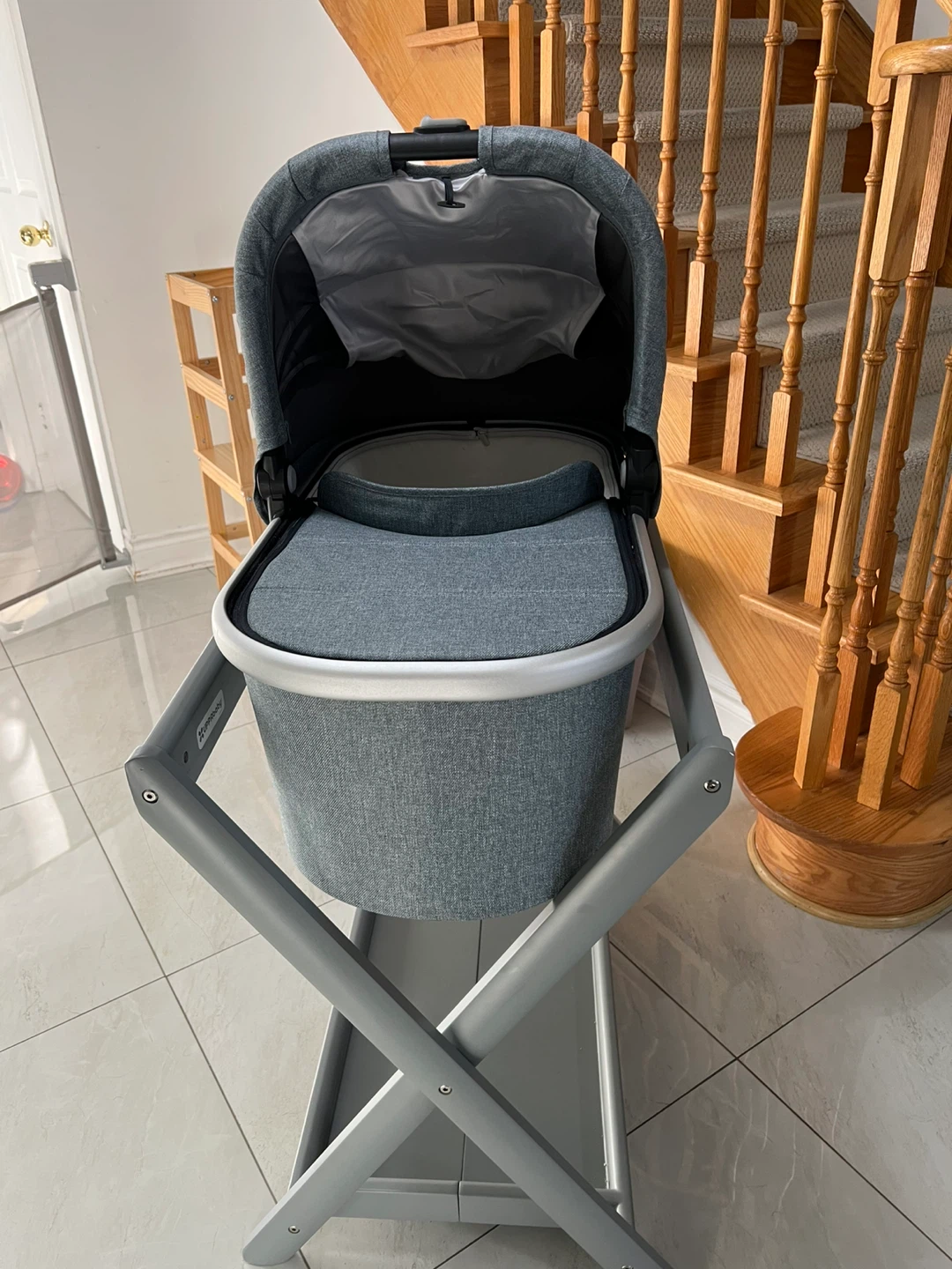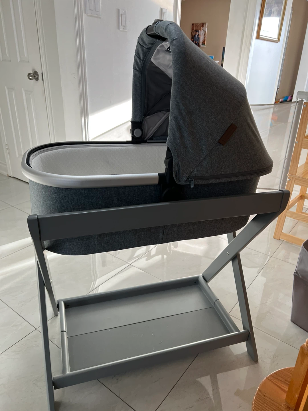 This UPPAbaby bassinet comes with its own stand, making it super handy for your little one. It's a comfy spot for naps and has a grey fabric finish. Great for newborns!