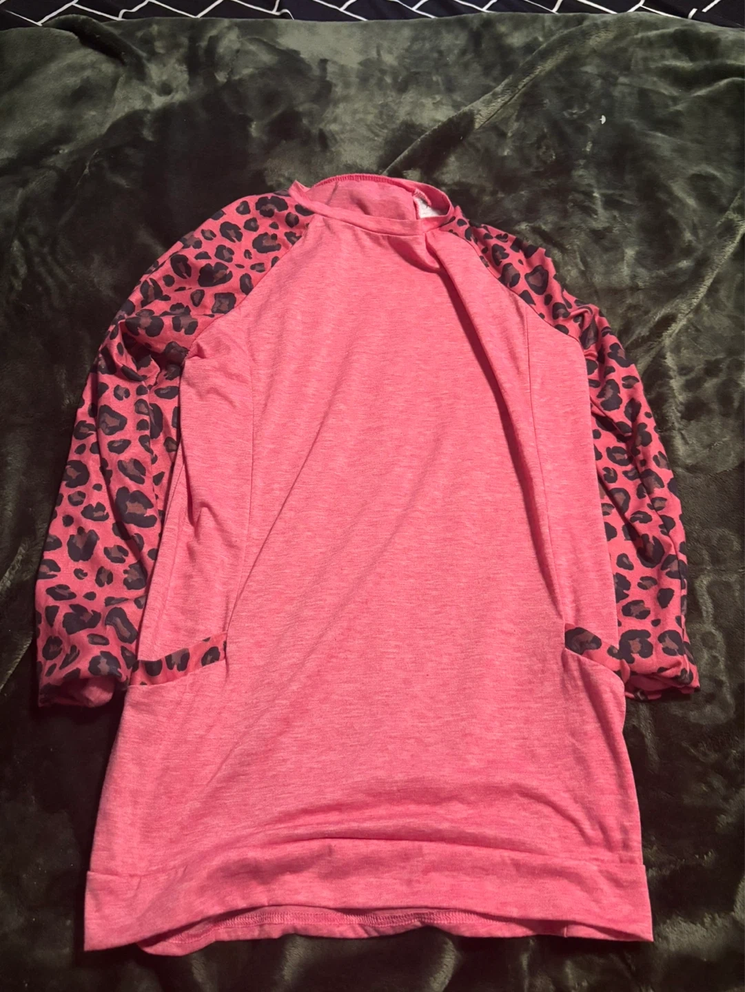This pink long-sleeved top features contrasting leopard print sleeves and side pockets. It's a comfortable and stylish addition to any casual outfit.