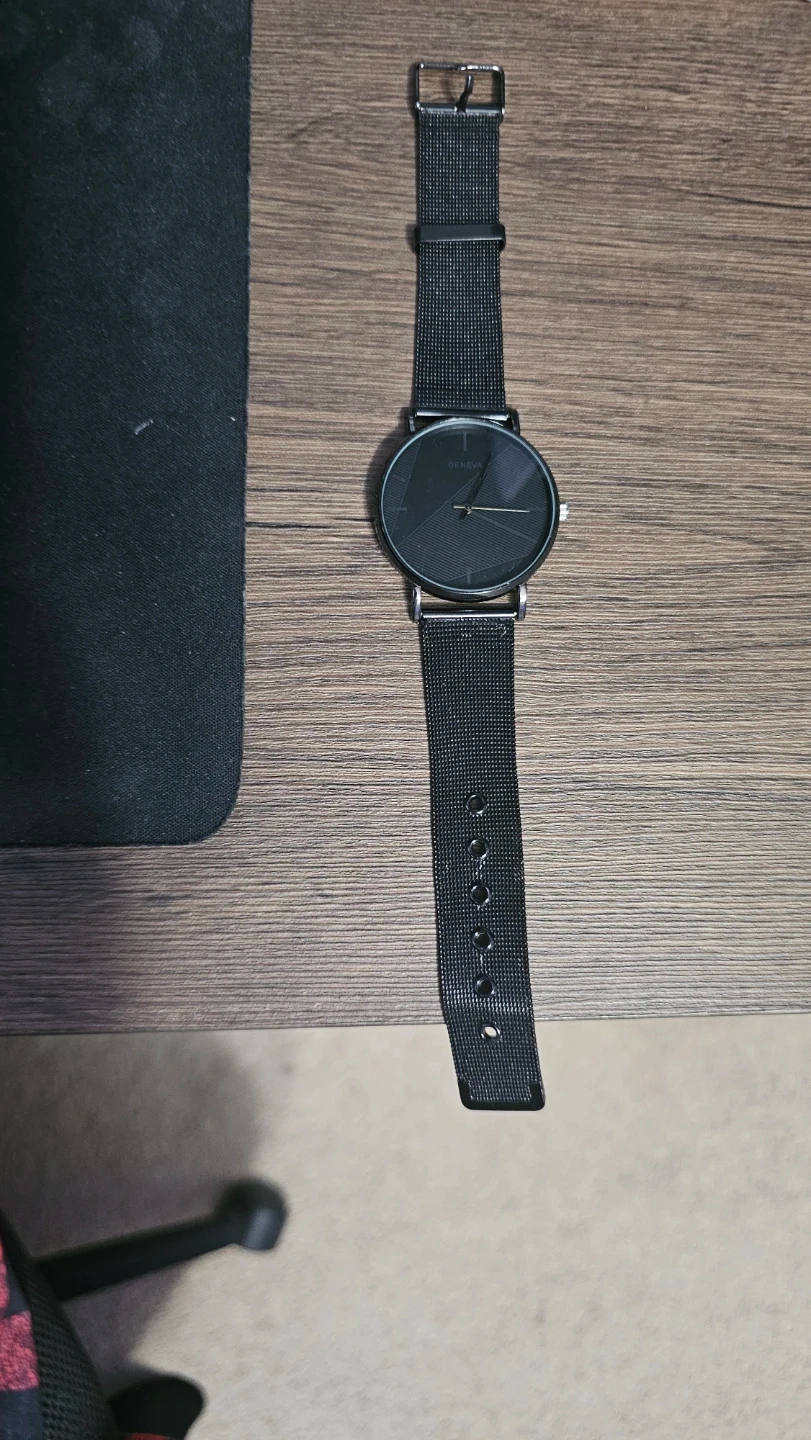 Selling a Geneva watch with a sleek black design. The band is a mesh style, and the face has a minimalist look. It's in great shape and ready for a new wrist!