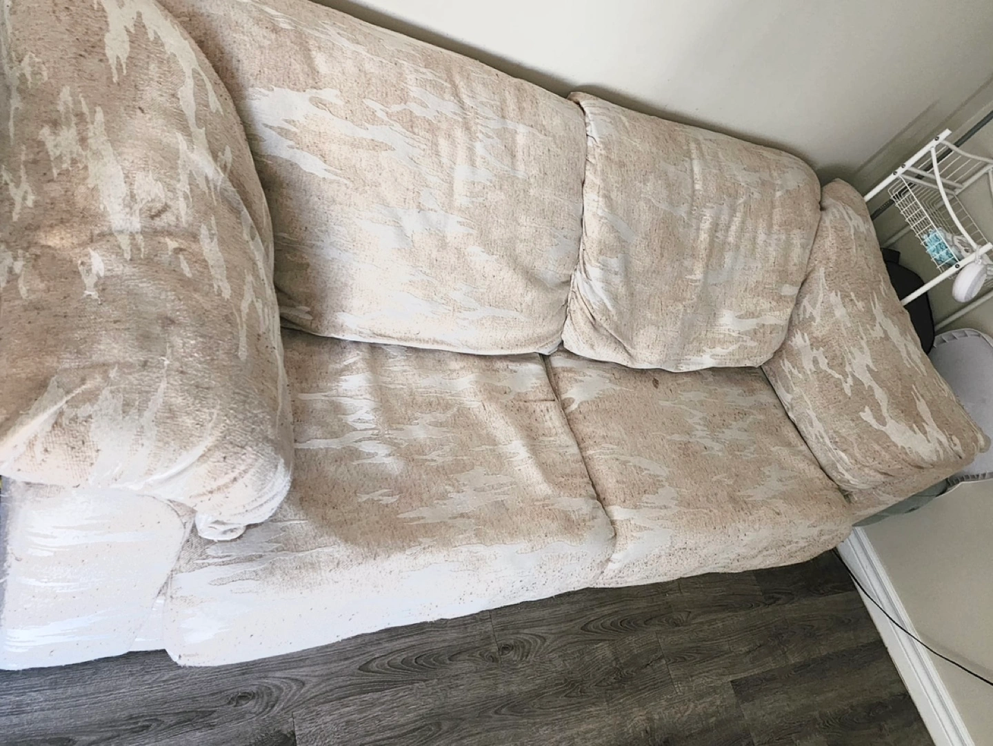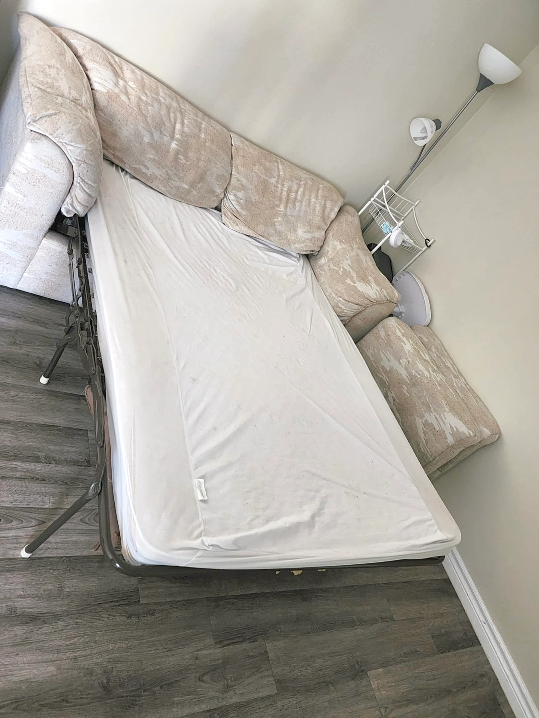 Beige pull-out sofa bed. Includes cushions and mattress. Mattress is removable for easy cleaning. Good condition. Smoke free, pet free home.