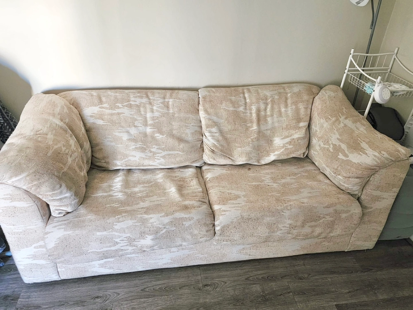 Beige pull-out sofa bed. Includes cushions and mattress. Mattress is removable for easy cleaning. Good condition. Smoke free, pet free home.