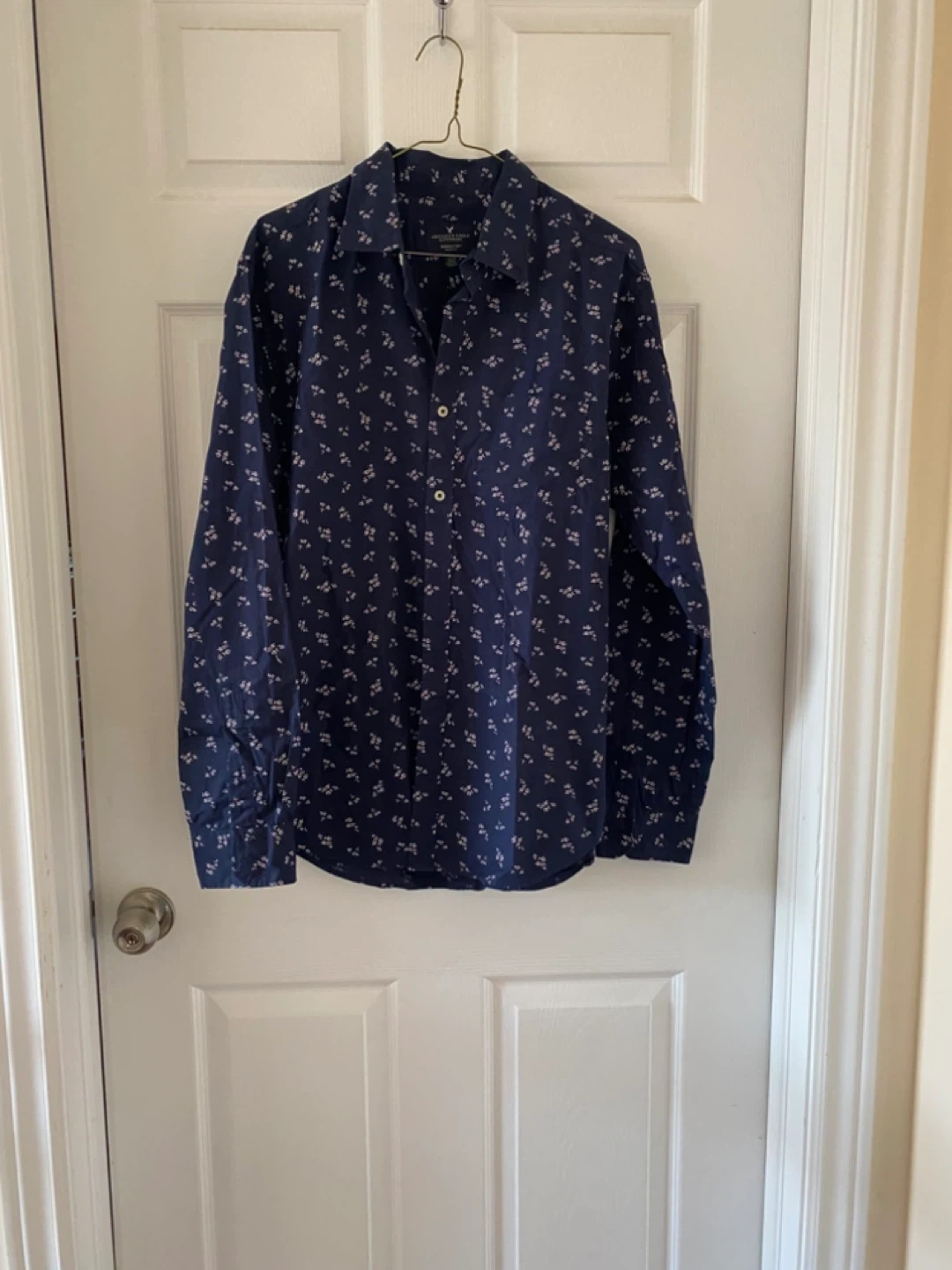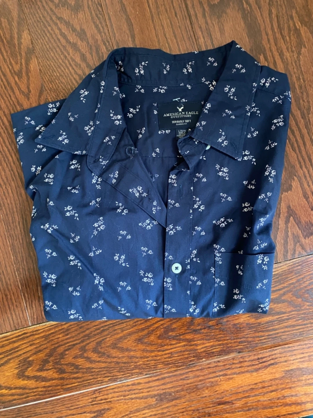 This is an American Eagle Outfitters "Seriously Soft" Classic Fit button-up shirt. It's navy with a small white floral pattern. size L.