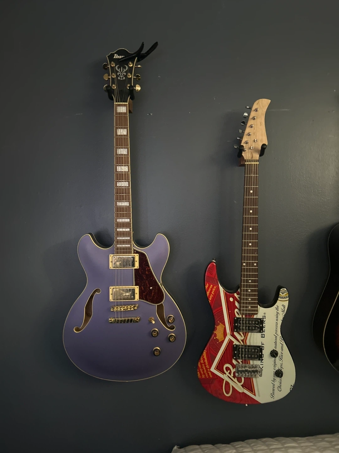 Purple Ibanez semi-hollow electric guitar. It has gold hardware and a tortoise shell pickguard. The neck is maple with block inlays. Perfect for blues or jazz playing! Budweiser guitar doesn’t work well needs trust rod adjustment but more of a show guitar
