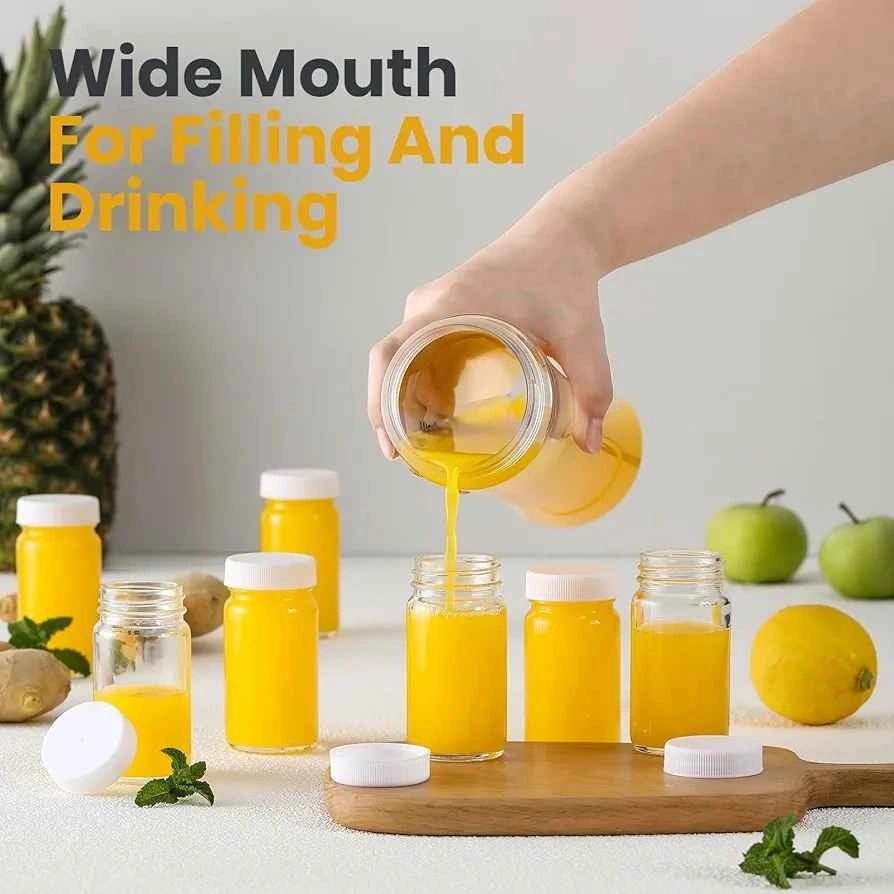 These are great for ginger shots, wellness shots, juice, samples, or even whiskey. They are travel-sized mini bottles with a wide mouth and are leakproof. Dishwasher safe.
