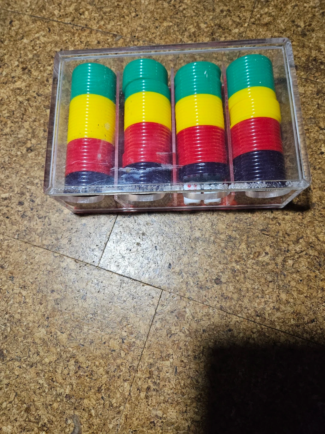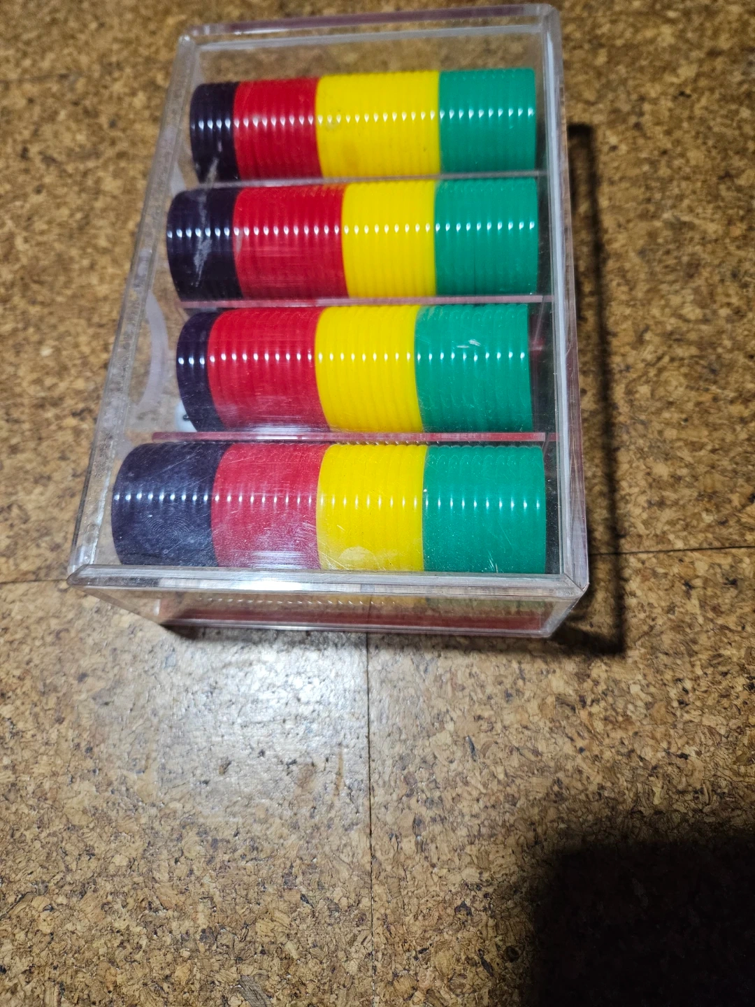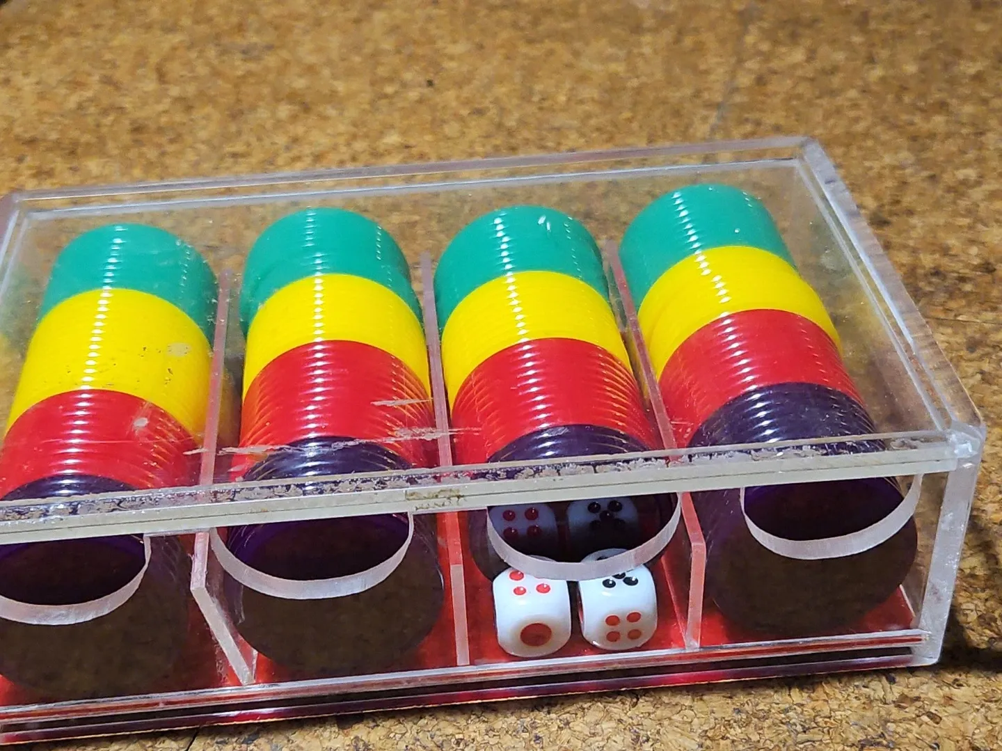 Four stacks of colourful poker chips in a clear plastic case. Includes two dice. These chips are great for casual game nights or for starting out your poker collection!