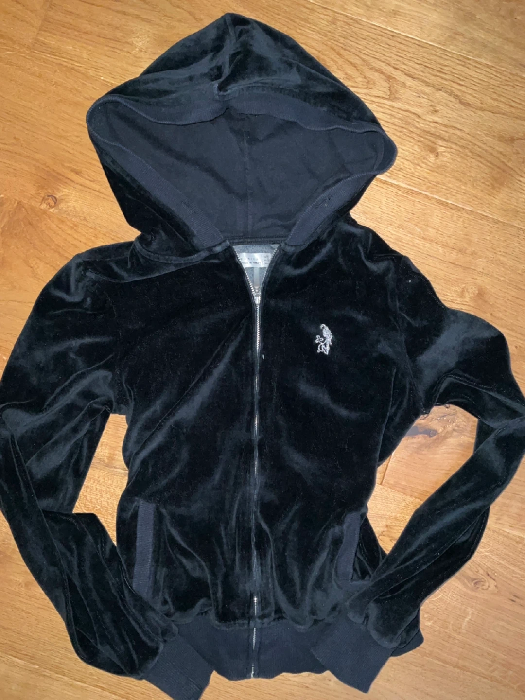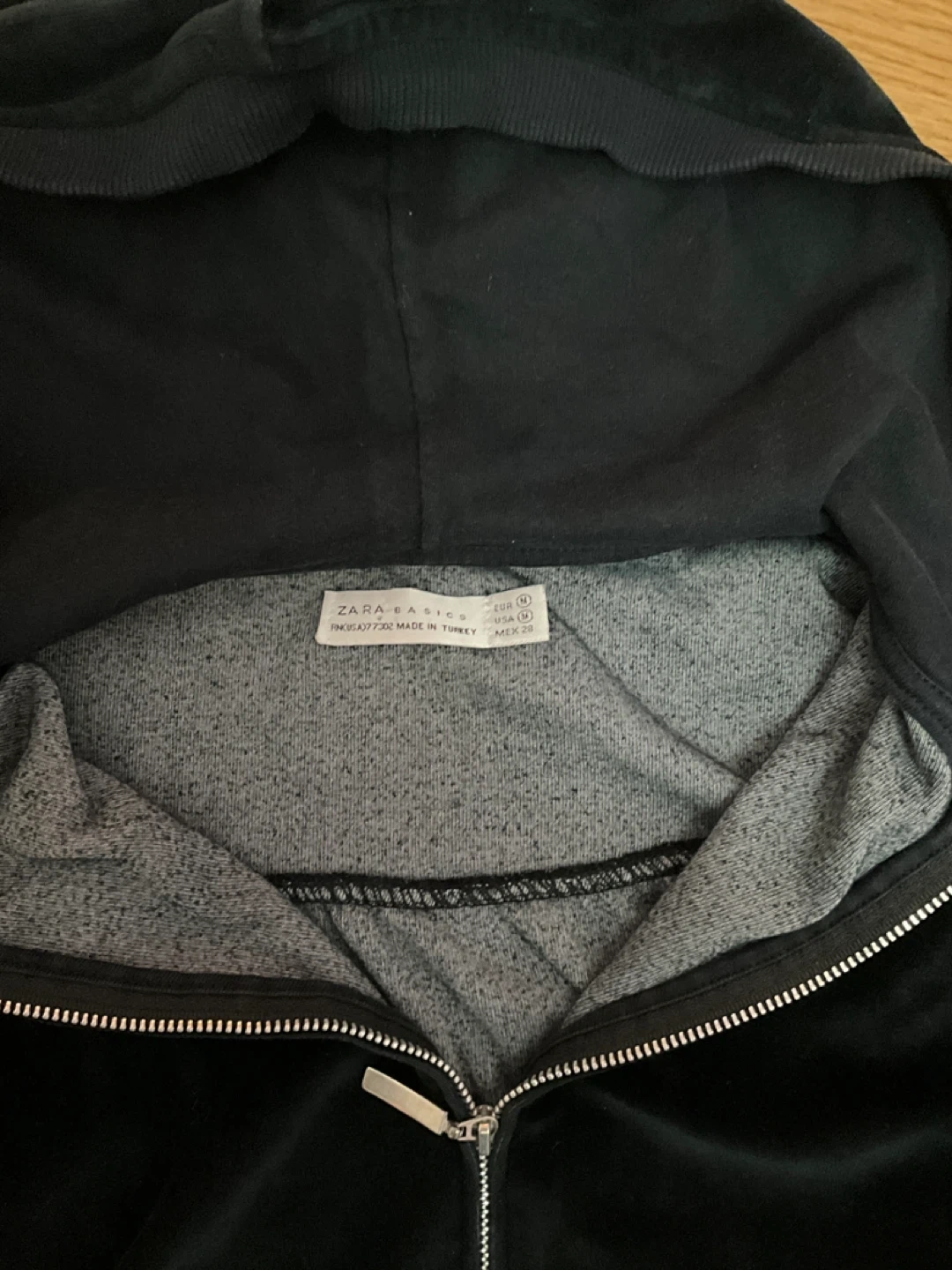 This is a black velvet zip-up hoodie from Zara Basic. It's a size medium. The material is soft and comfortable.