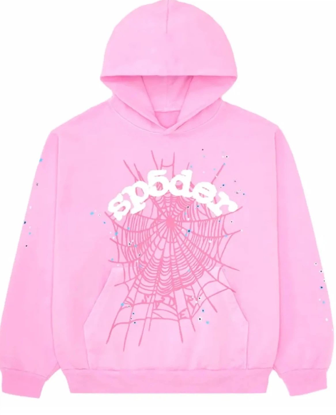 This is a pink hoodie with a spider web graphic and "sp5der" logo. It's a comfortable pullover style with a front pocket. The fabric feels soft and durable. 1 of 1 rep