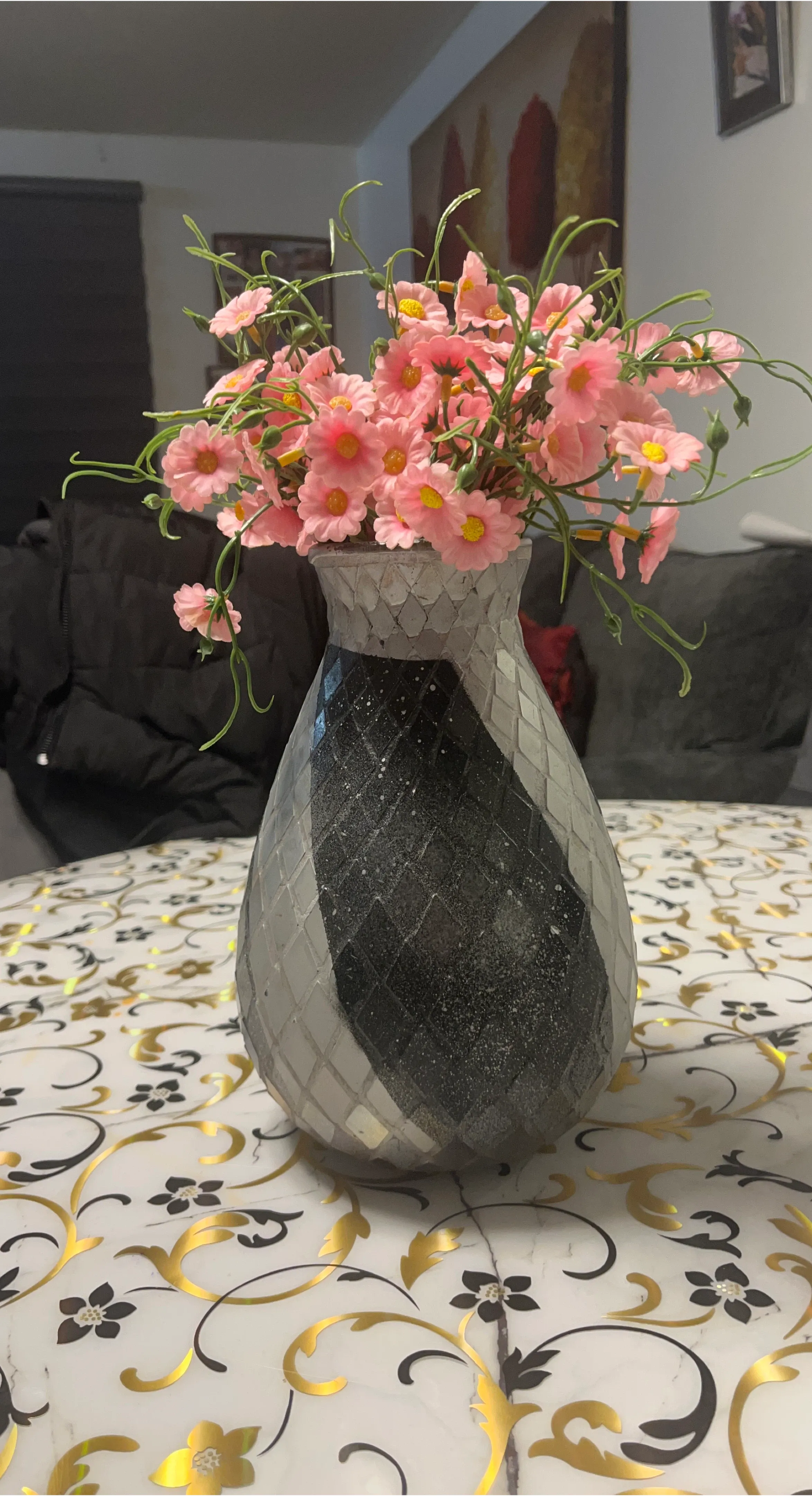 Decorative mosaic vase featuring a diamond pattern in grey and black. It's filled with artificial pink daisies with yellow centres and green stems. This vase is ideal for adding a touch of colour to any room.