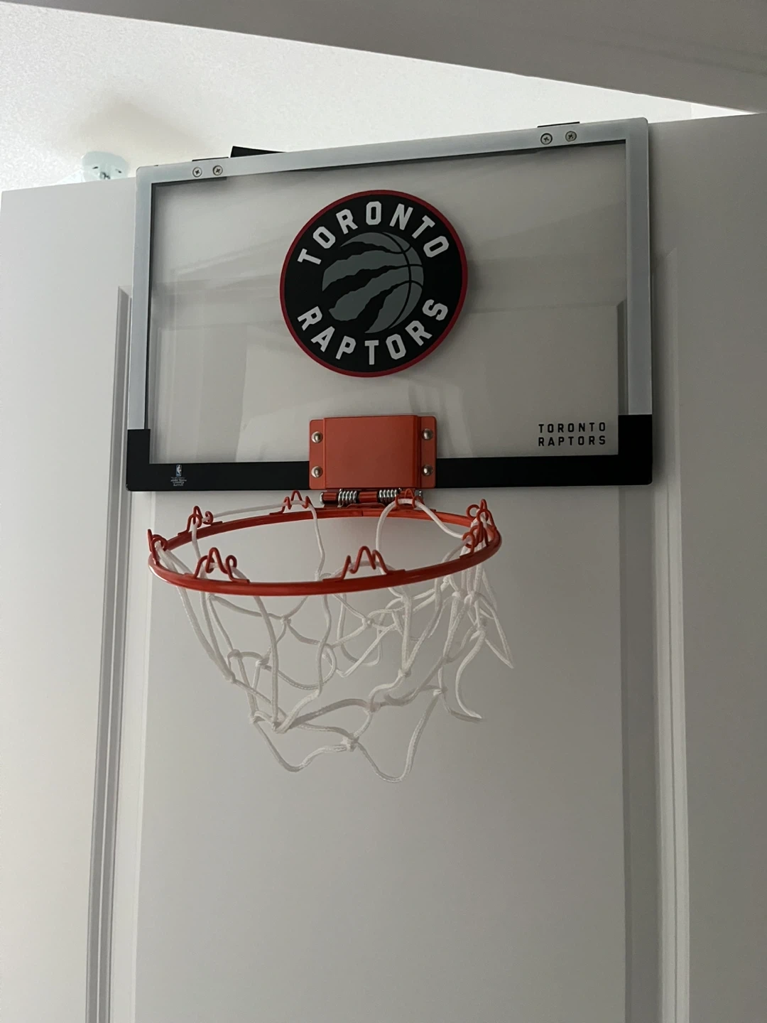 Mini basketball hoop with Toronto Raptors branding. It's perfect for some indoor hoop action. Backboard is clear plastic with a red rim and white net. Comes with ball.