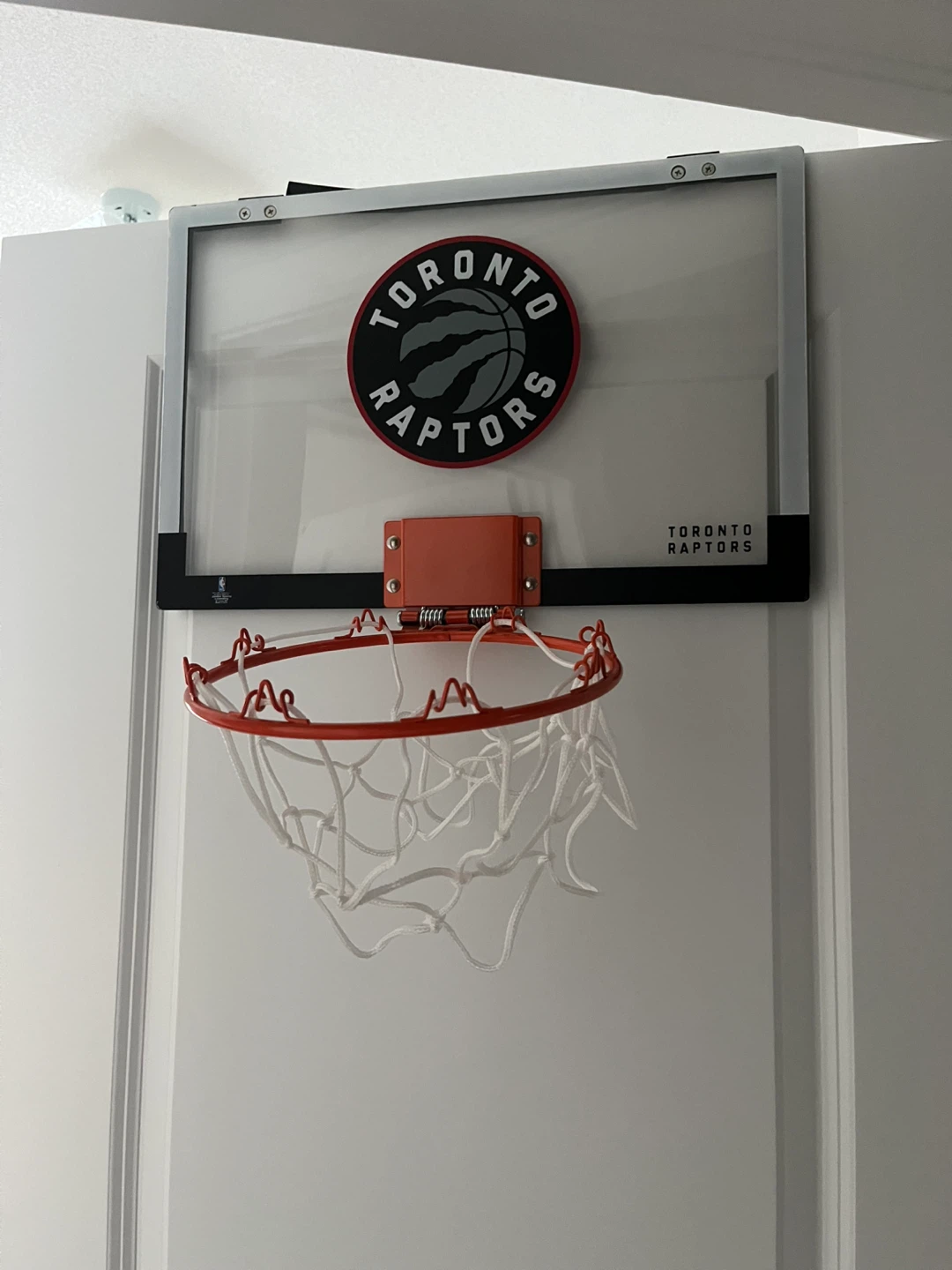 Mini basketball hoop with Toronto Raptors branding. It's perfect for some indoor hoop action. Backboard is clear plastic with a red rim and white net. Comes with ball.