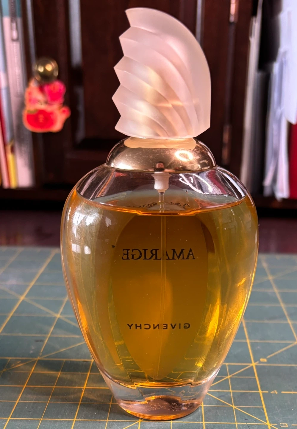 This is a bottle of Givenchy Amarige Eau de Toilette. Made in France. Glass bottle with decorative cap. Has been used. Approximately 3 oz left of a 3.3 oz bottle.