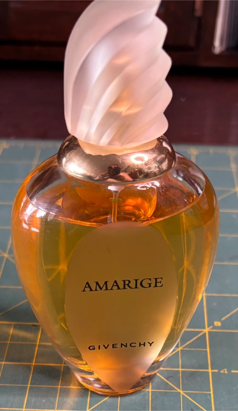 This is a bottle of Givenchy Amarige Eau de Toilette. Made in France. Glass bottle with decorative cap. Has been used. Approximately 3 oz left of a 3.3 oz bottle.