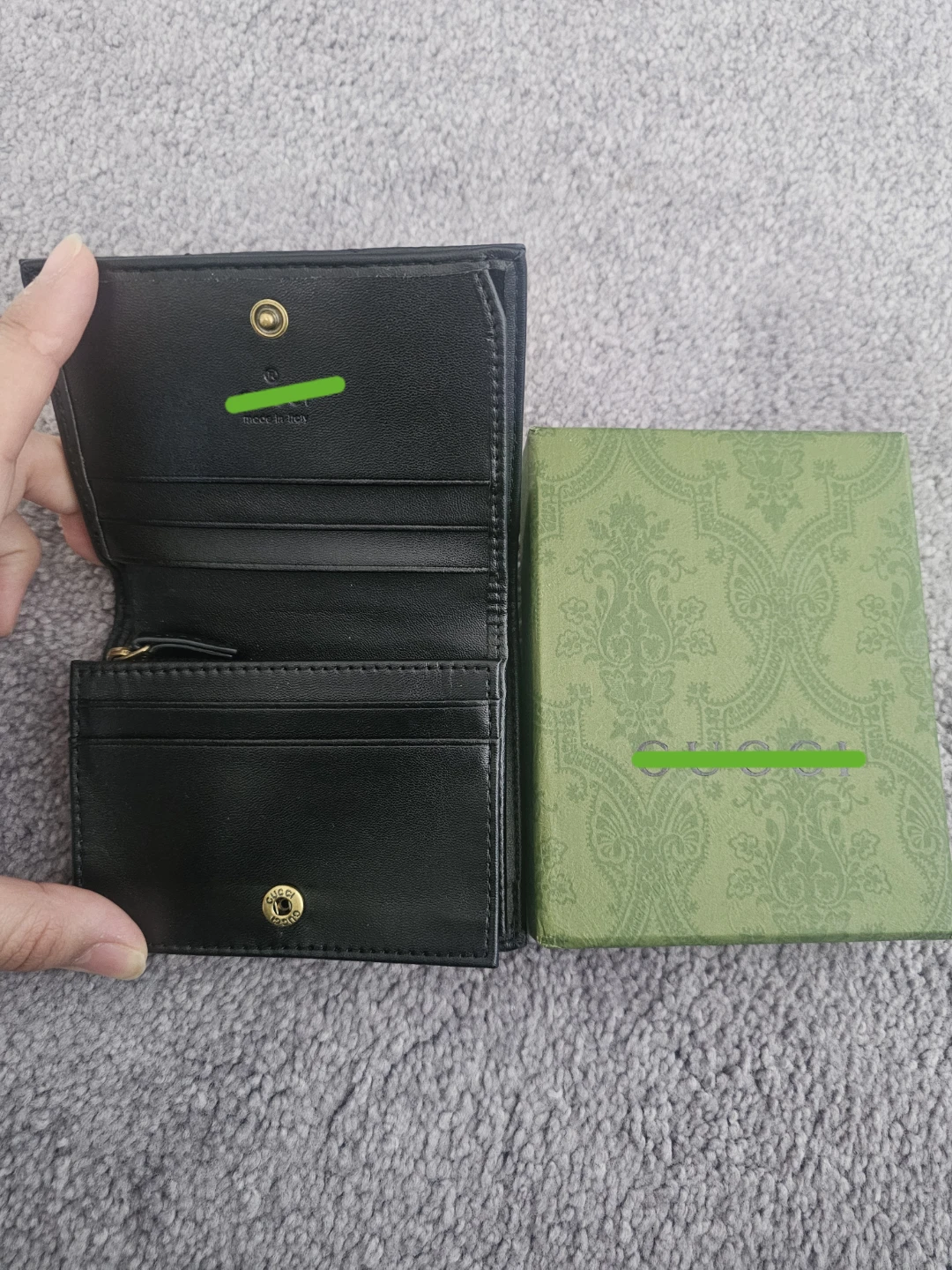 This is a black quilted leather bifold wallet. It is inspired by the iconic GG logo hardware. Has multiple card slots and a zipper pouch inside. Includes box and duster bag. Message for more pictures