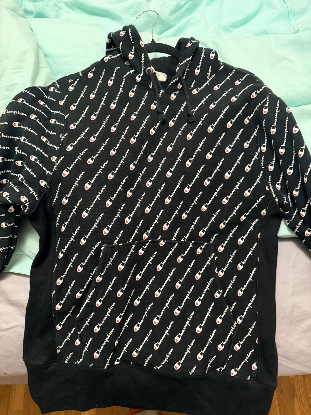 This is a black Champion hoodie with an all-over repeating logo pattern. It features a drawstring hood and a front kangaroo pocket. Made from a comfortable cotton blend. Very thick and warm,size m