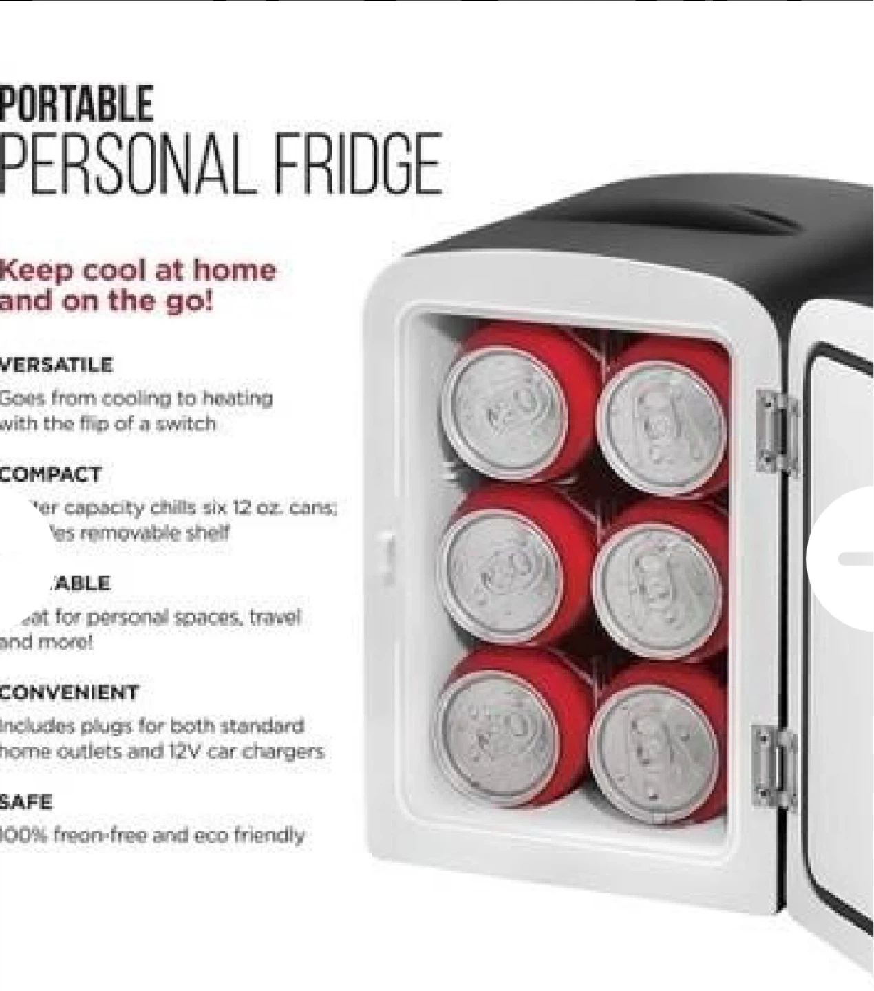 This is a portable personal fridge from Chefman. It's compact and capable of chilling up to six 12 oz. cans. Includes plugs for both standard home outlets and 12V car chargers.