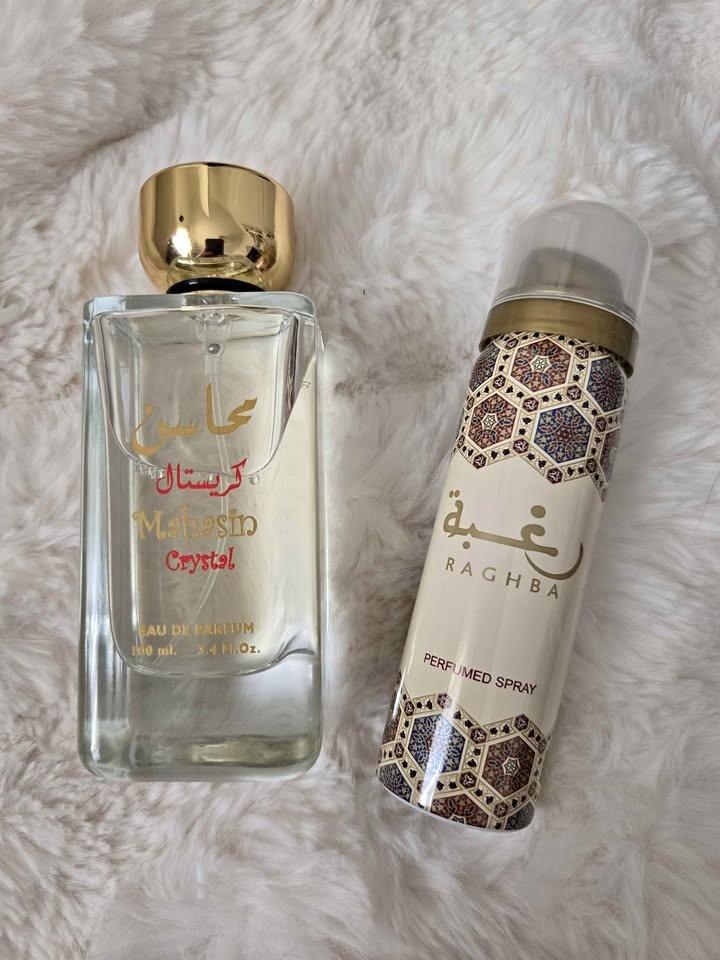 Bundle featuring Mohasin Crystal Eau de Parfum and Raghba Perfumed Spray. Mohasin Crystal is a warm, slightly sweet fragrance with a clean, elegant feel — great for everyday wear. Raghba perfumed spray is a popular Middle Eastern scent used as a body spray or for layering. Middle Eastern / Arabic fragrances. Warm, sweet, and comforting scent profiles. Large 100 ml perfume bottle. Great value bundle. Comes in original packaging.