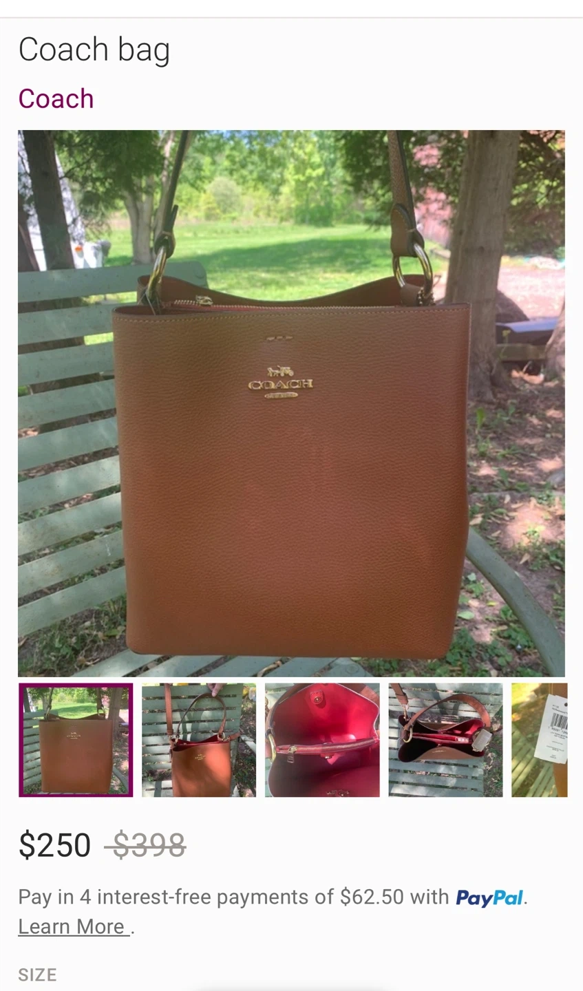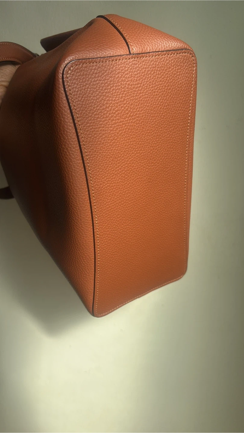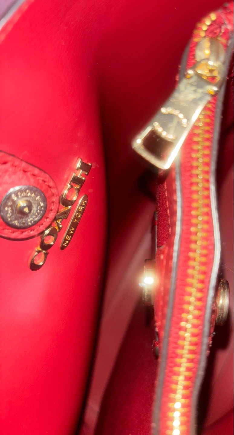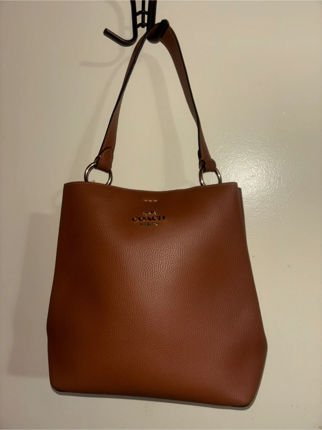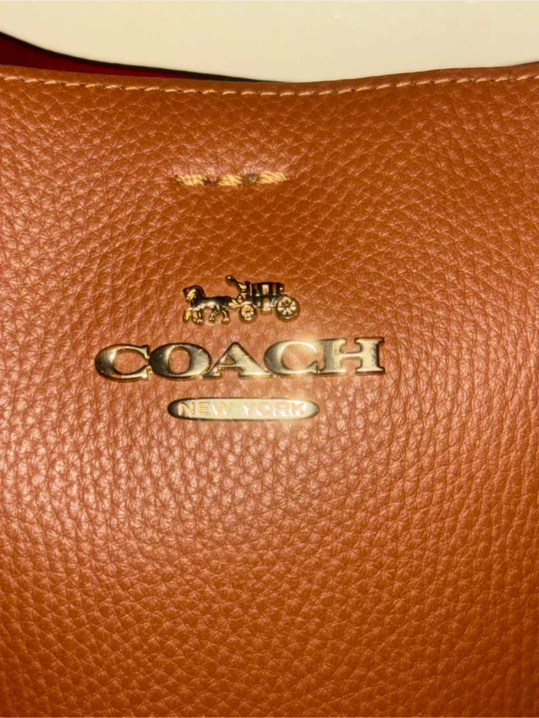 This is a Coach bucket bag made from textured leather. It features a classic saddle brown colour and a red interior lining. The bag's interior includes a Coach creed stamp and serial number.