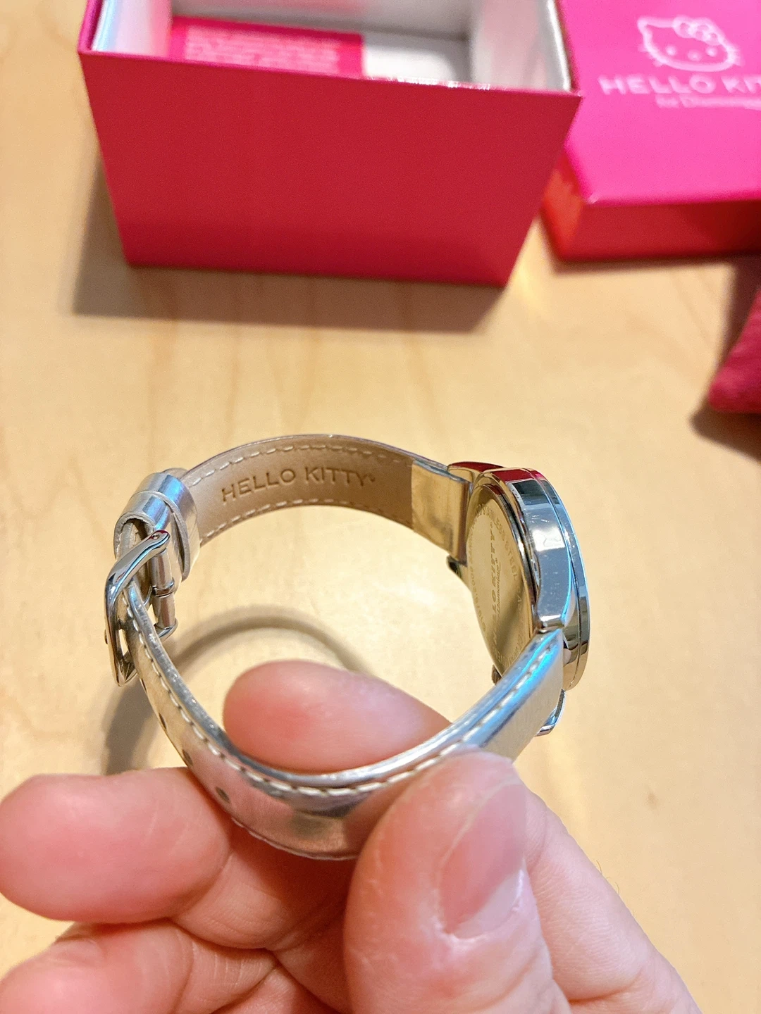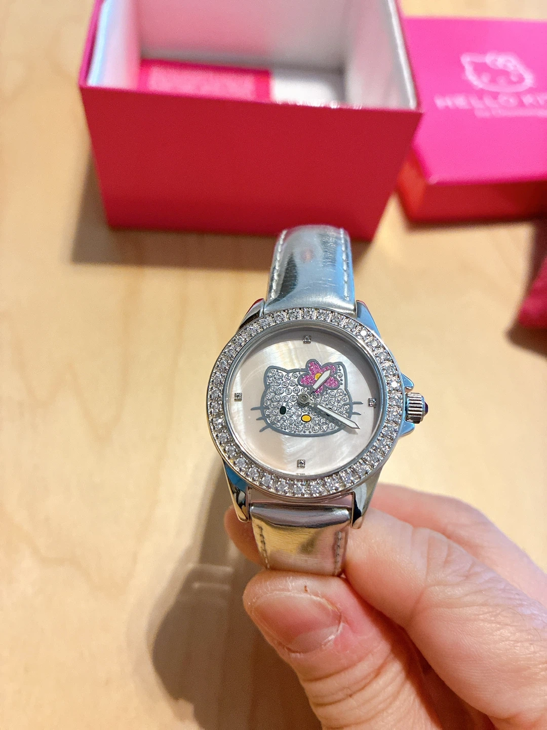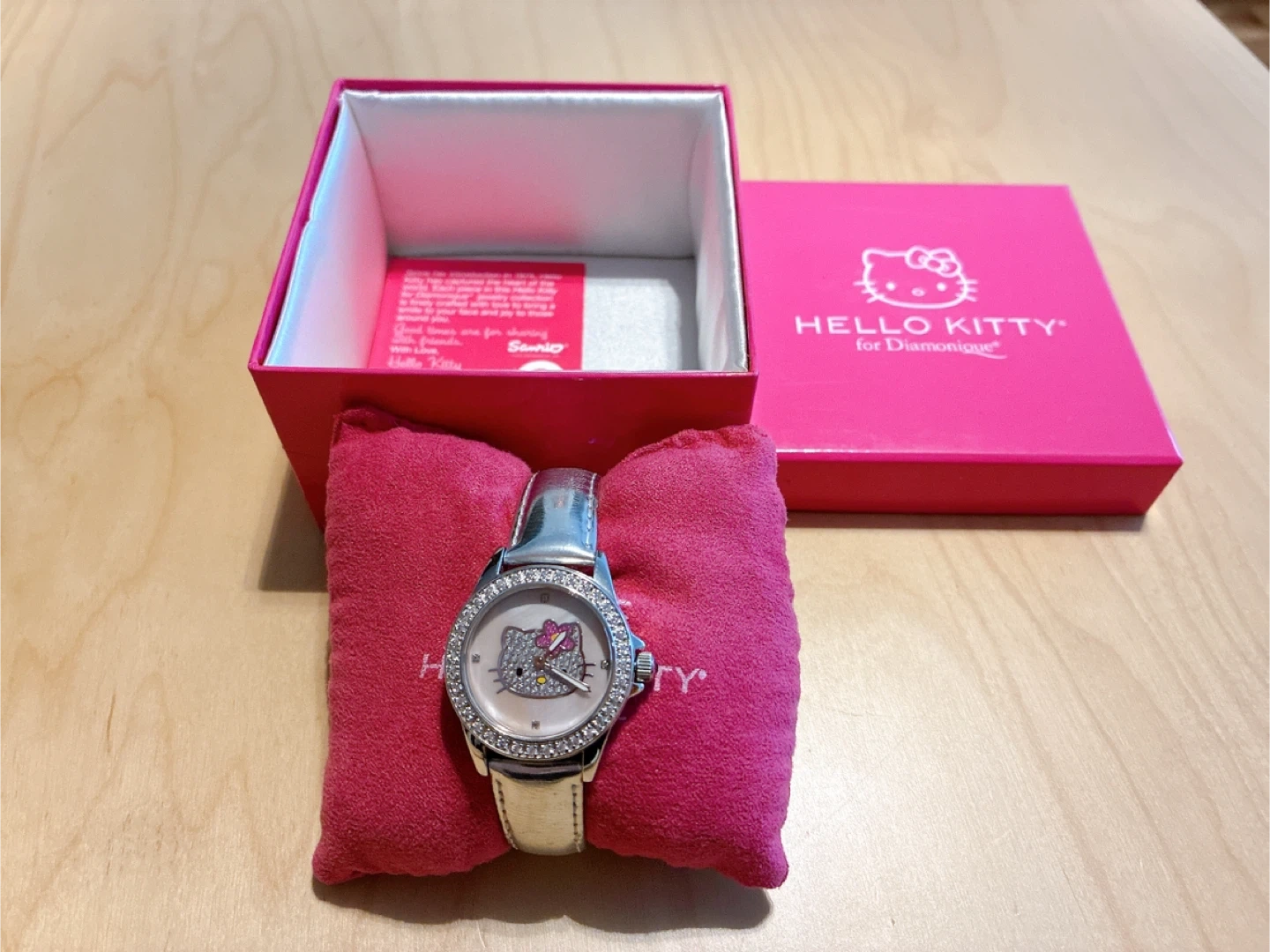 This Hello Kitty watch features a silver-tone band and a sparkly dial. It's adorned with small crystals around the bezel. Includes the original pink presentation box. A fun accessory for any Hello Kitty fan!