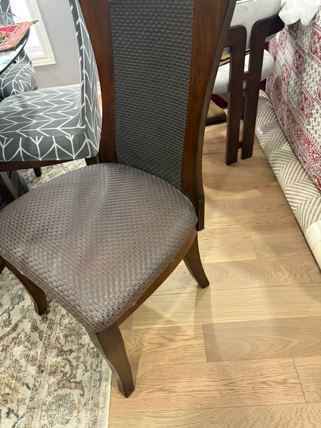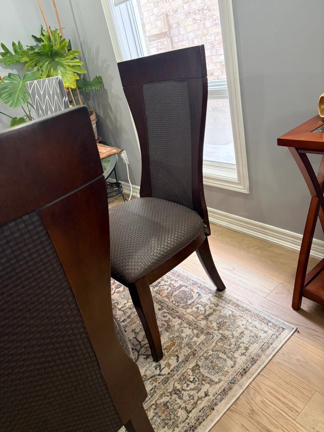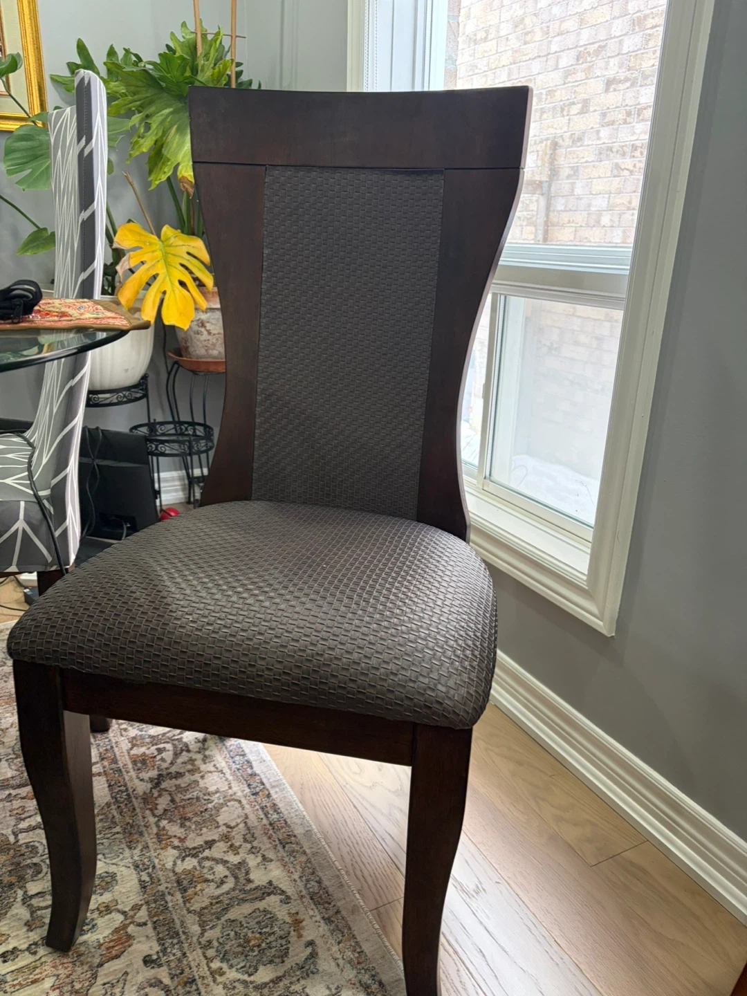 Dark Wood Dining Chair with Textured Grey Seat and Back