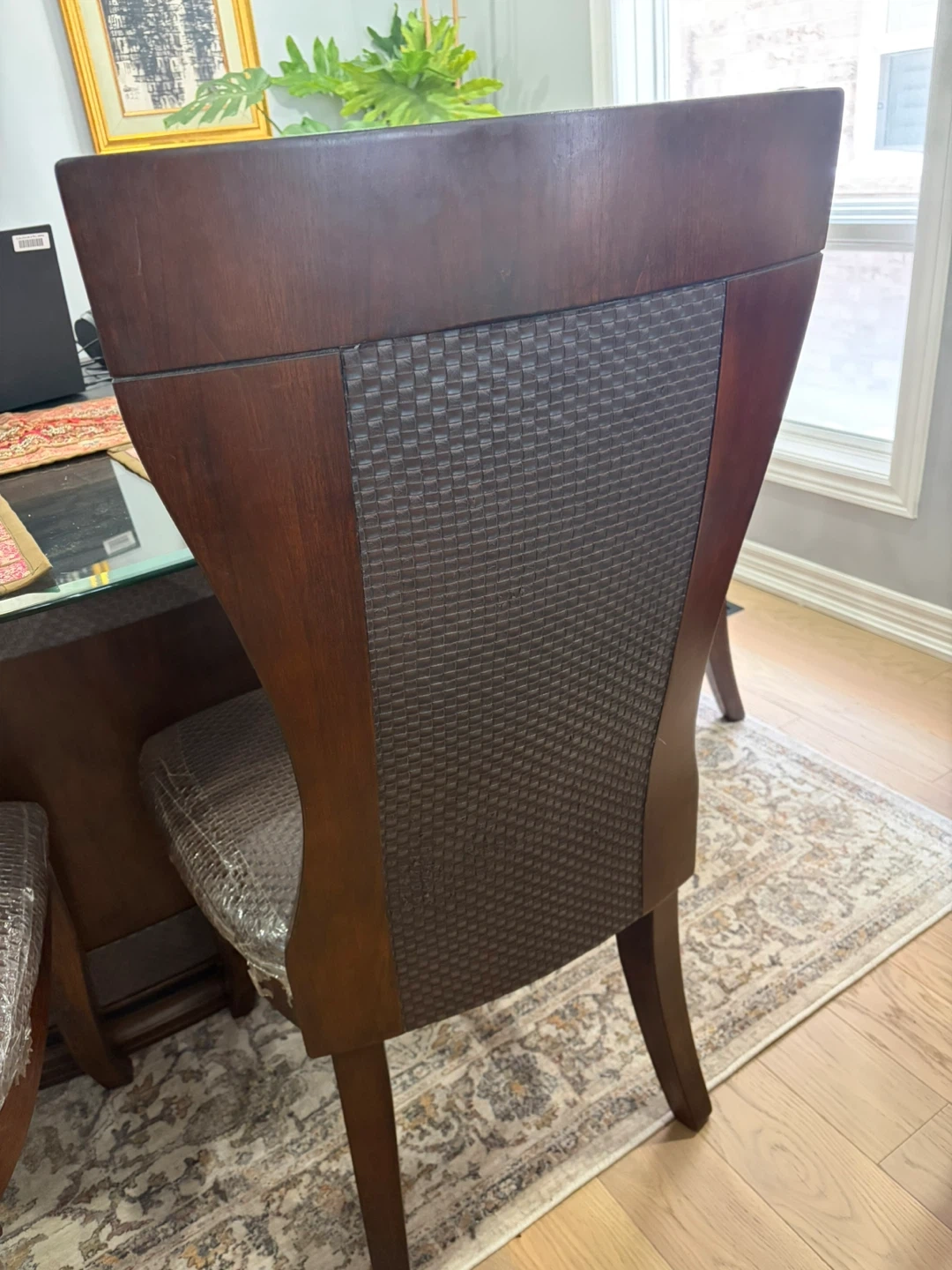 Elegant dining chair featuring a rich dark wood frame with a curved back. It has a textured brown upholstered seat and back panel for comfort. Sturdy construction and classic design.