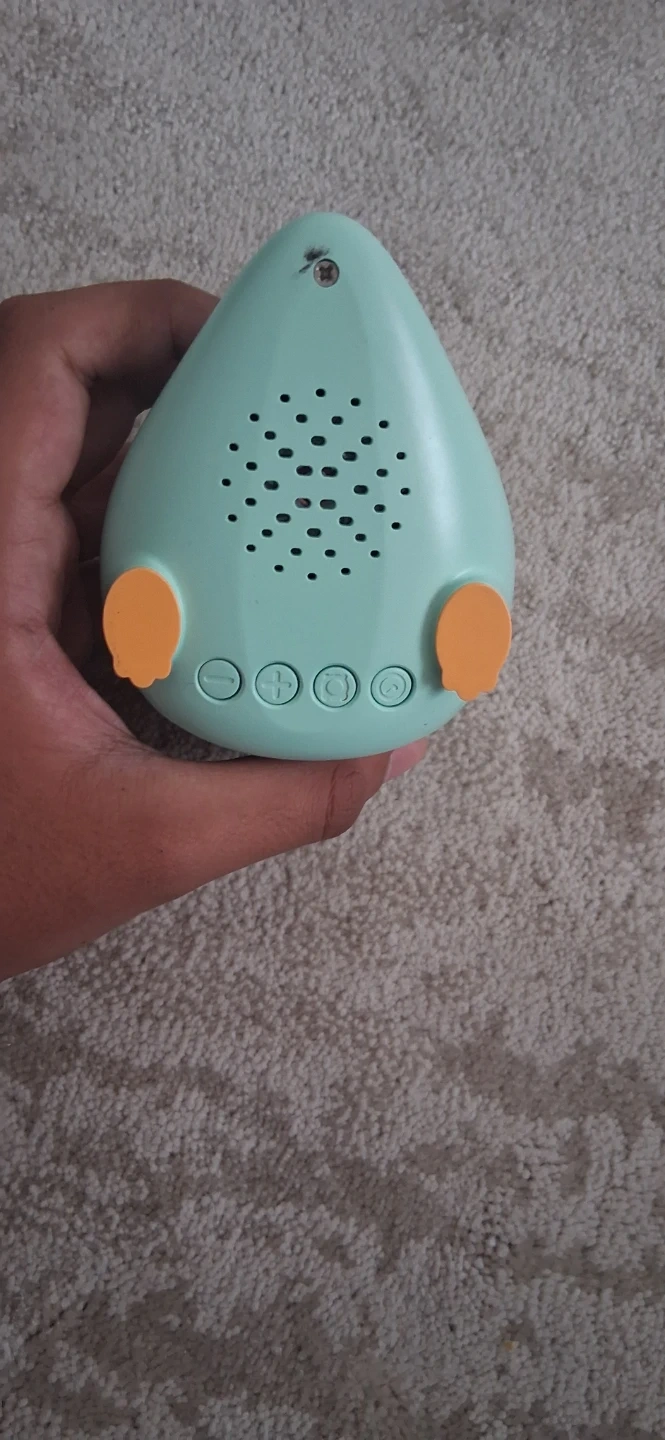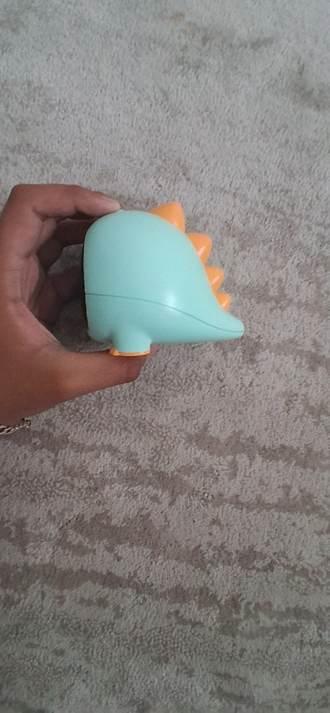 This is a charming dinosaur-shaped night light and alarm clock. It's teal with orange accents, featuring buttons on the back for settings. This fun device is great for a child's bedroom!