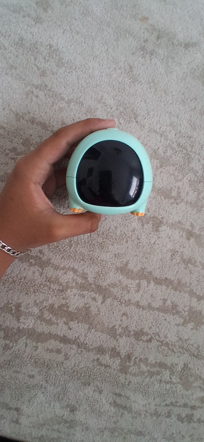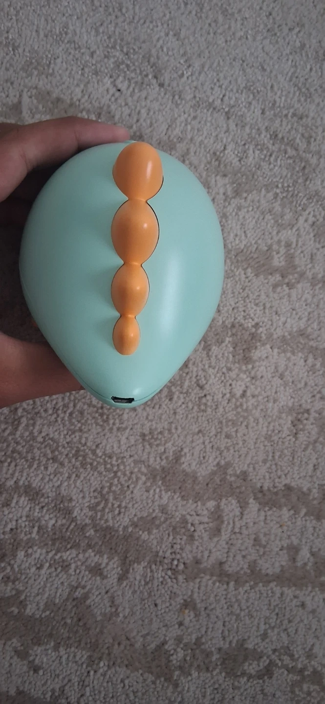 This is a charming dinosaur-shaped night light and alarm clock. It's teal with orange accents, featuring buttons on the back for settings. This fun device is great for a child's bedroom!
