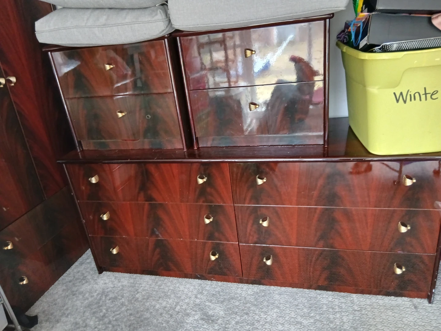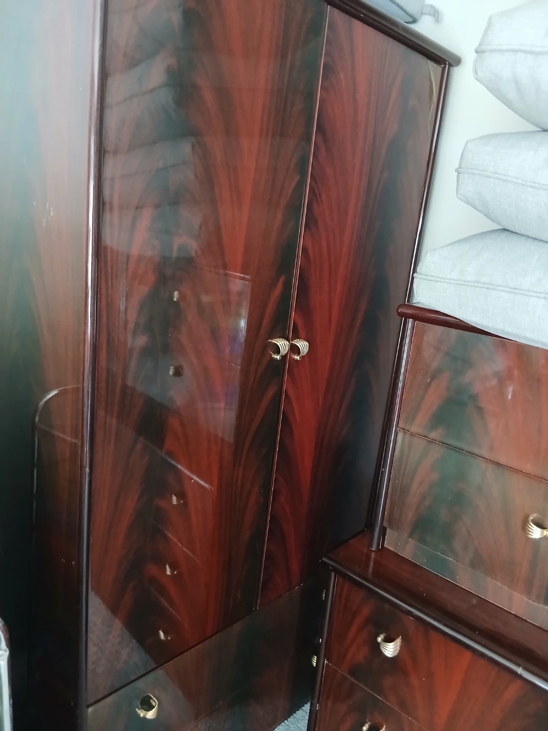 A spacious armoire wardrobe featuring a rich, dark wood veneer with a high-gloss finish. It includes a hanging rod and three shelves inside, along with two drawers at the bottom. This piece would be useful for storing clothes or linens.