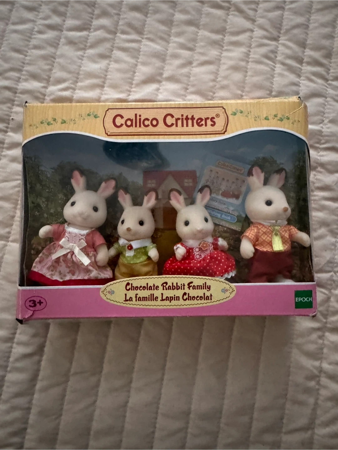This is the Chocolate Rabbit Family set by Calico Critters. It includes four adorable rabbit figures, each dressed in unique outfits. Recommended for ages 3 and up.