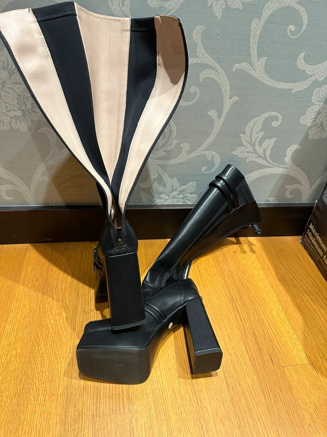 These platform knee high boots are in great condition! They feature a stylish, chunky platform and a sleek black finish. Perfect for adding a bit of edge to any outfit!