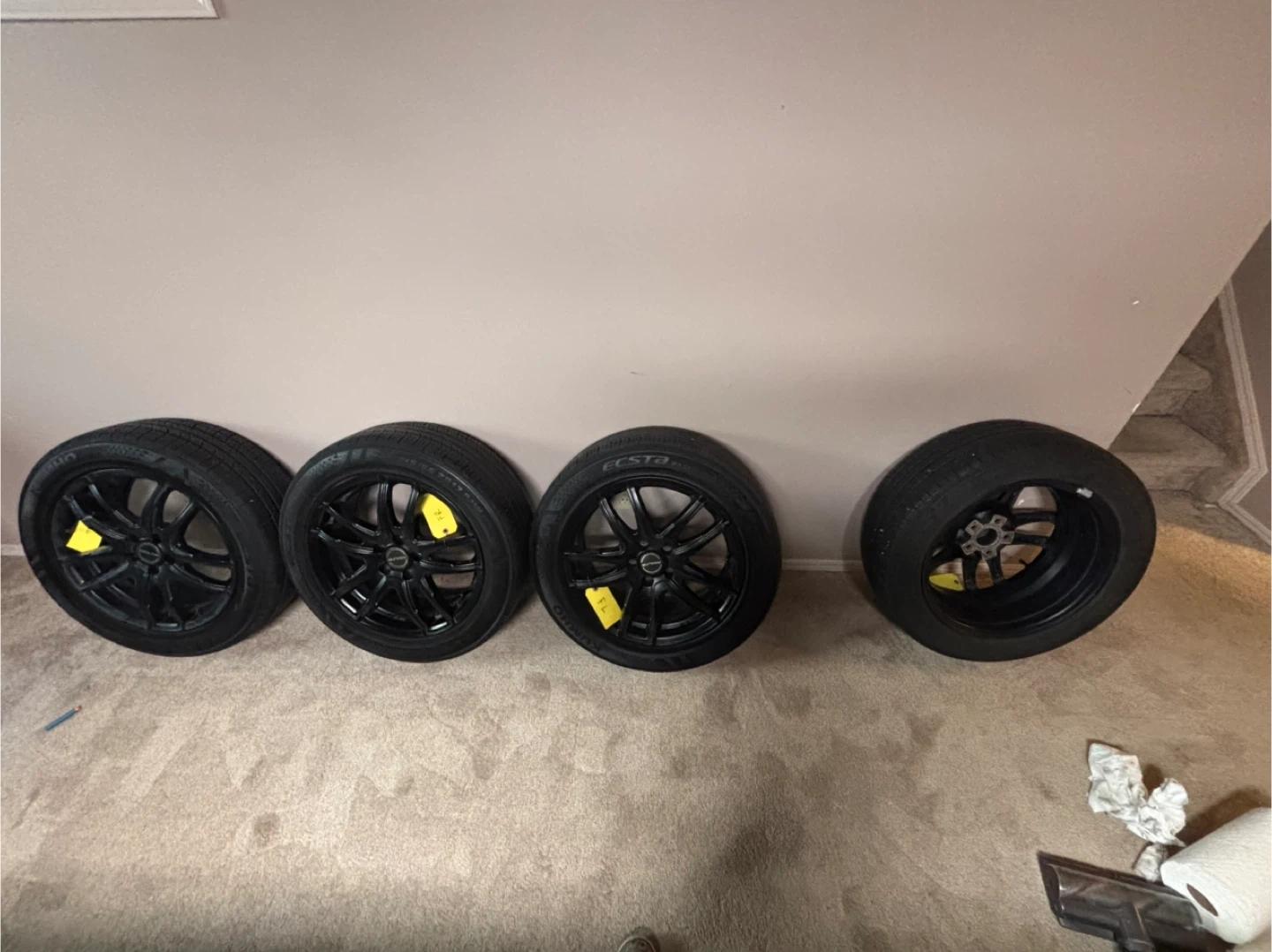 Set of four Kumho Ecsta PA51 tires, size 215/55R17 94W. These are summer tires and have been used for one season. The bolt pattern is5 x 105 and the Center bore is 56.6 in diameter.