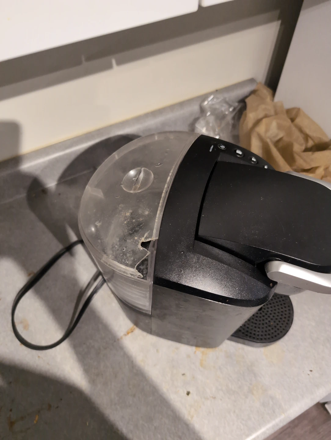 Selling a Keurig coffee maker! It's in good working condition and ready to brew your favourite coffee. It's black and perfect for any kitchen countertop. Small crack on filling unit.