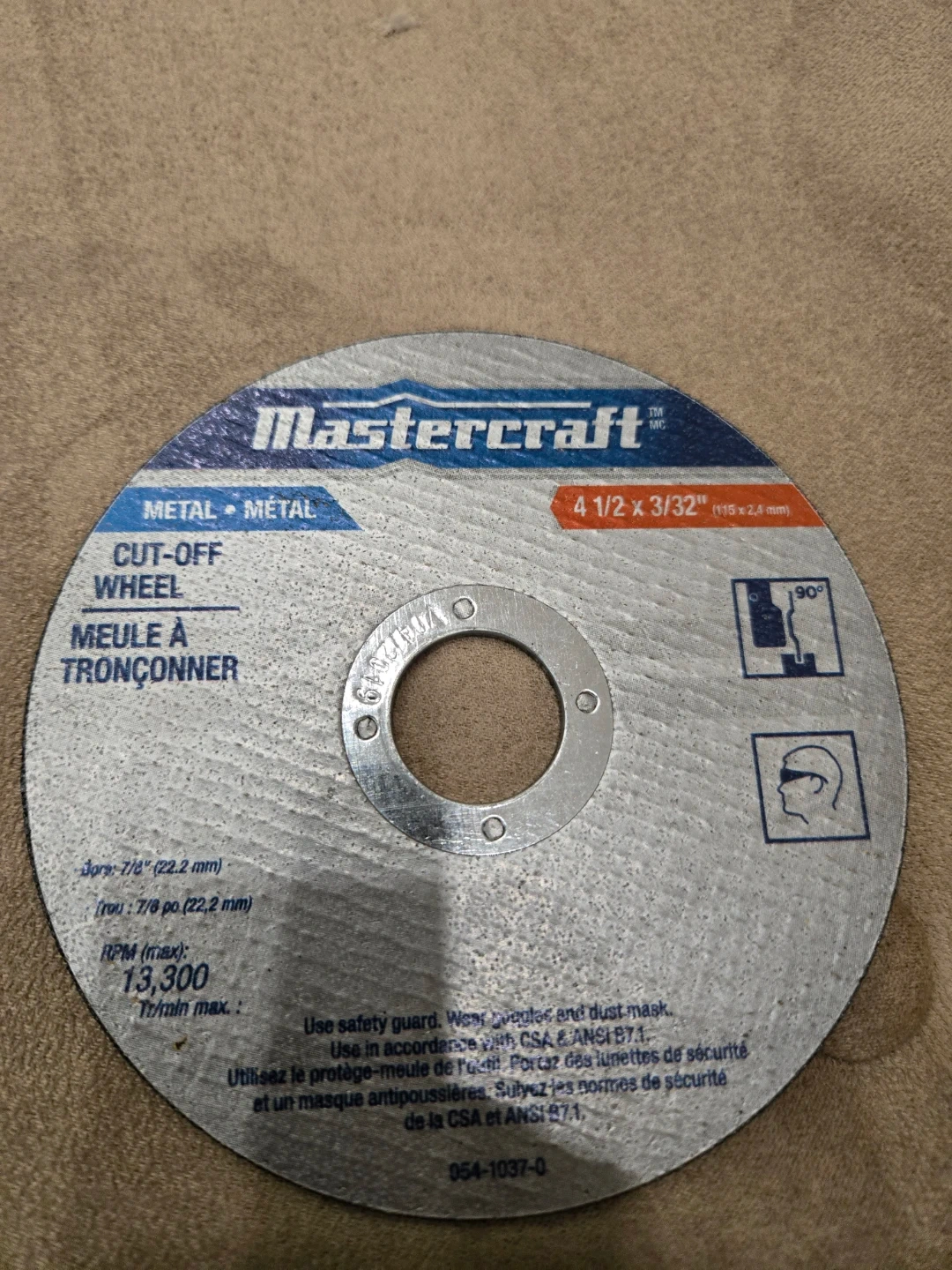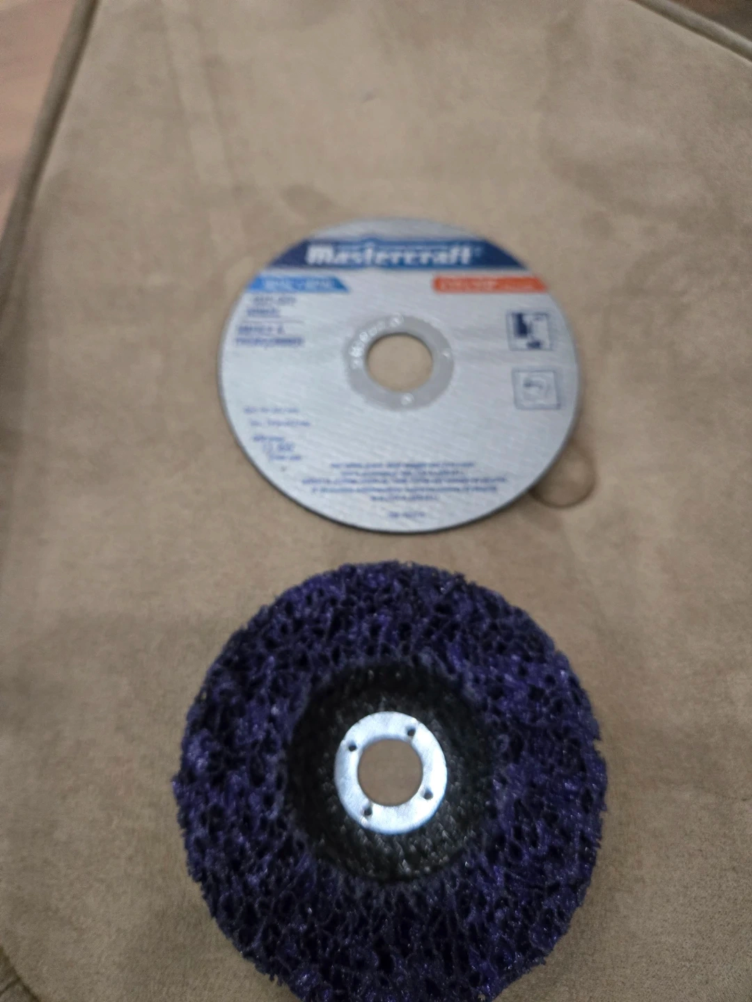 This is a Mastercraft cut-off wheel for metal and a purple flap disc. The cut-off wheel is 4 1/2 x 3/32 inches. It's rated for 13,300 RPM max. The flap disc is also for metal applications.4" . Great for grinding and smoothing metal surfaces!