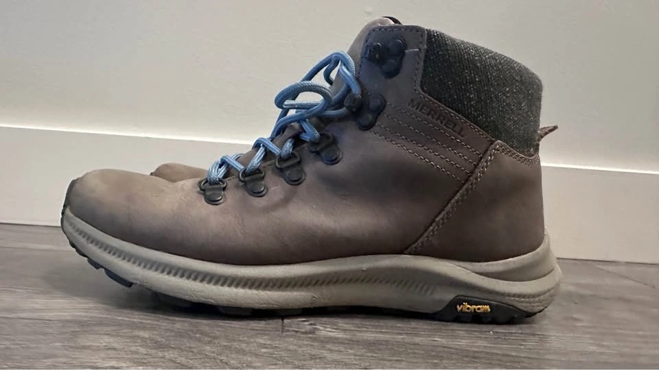 Lightly used women’s Merrell hiking boots in a versatile gray-brown (granite/earthy tone) with cool blue laces. These are classic Merrell quality — comfy cushioning, solid traction (Vibram-like outsole still has good tread), breathable yet protective upper, and great ankle support from the mid-cut design. Showing normal trail wear: scuffs, fading, and dirt on the upper; soles worn evenly but with decent lug depth remaining. Clean interior, no tears. Blue laces. Perfect for day hikes, light trails, dog walks, casual outdoor wear, or as sturdy everyday boots. Merrell’s known for out-of-the-box comfort and reliability.