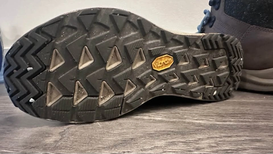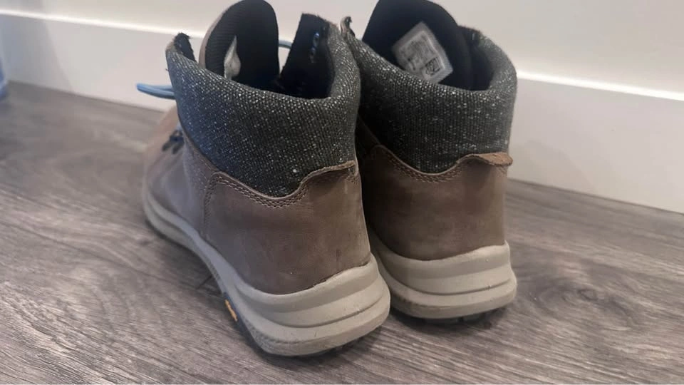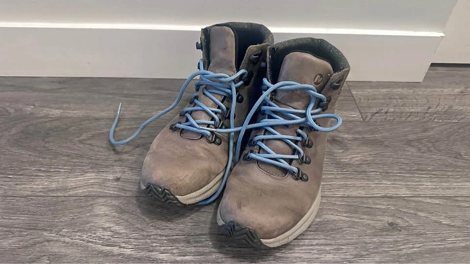 Lightly used women’s Merrell hiking boots in a versatile gray-brown (granite/earthy tone) with cool blue laces. These are classic Merrell quality — comfy cushioning, solid traction (Vibram-like outsole still has good tread), breathable yet protective upper, and great ankle support from the mid-cut design. Showing normal trail wear: scuffs, fading, and dirt on the upper; soles worn evenly but with decent lug depth remaining. Clean interior, no tears. Blue laces. Perfect for day hikes, light trails, dog walks, casual outdoor wear, or as sturdy everyday boots. Merrell’s known for out-of-the-box comfort and reliability.