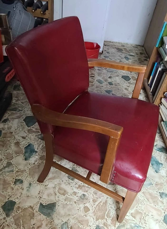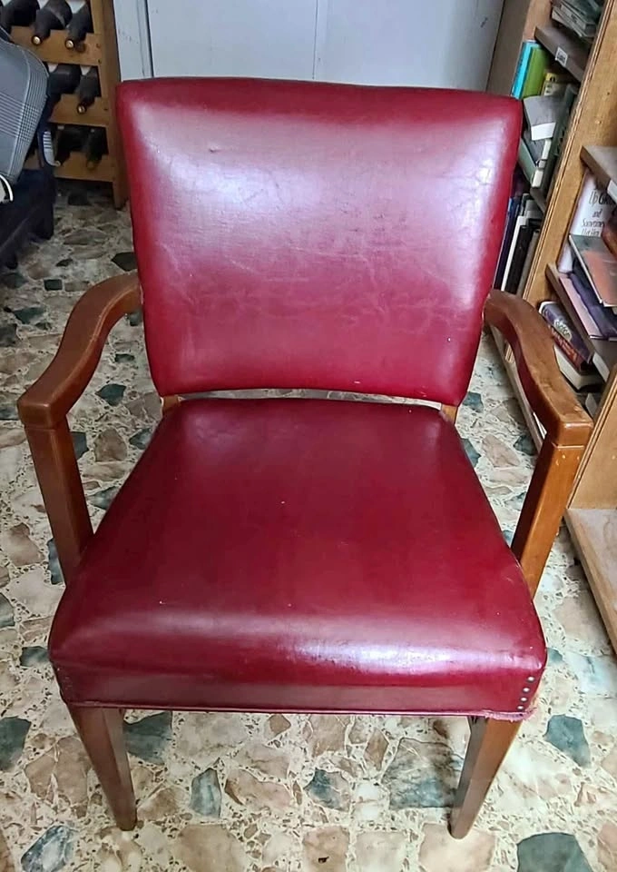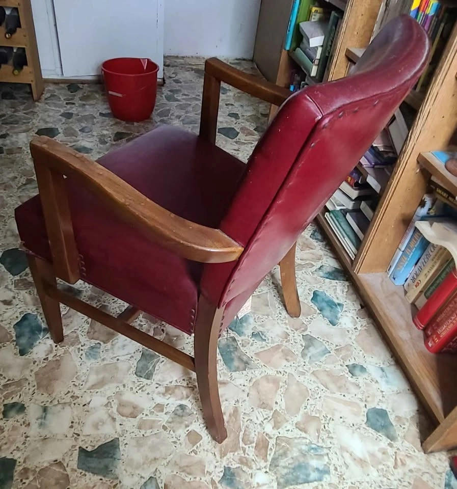 Going through basement cleaning and looking to get this red leather chair to a good home! Super sturdy with good upholstery. Can arrange for pick up at my house. It's a pretty heavy chair, around 40 pounds if I had to guess.